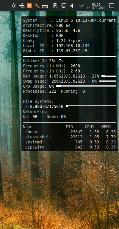 「システム情報」「ディストリビューション」「デスクトップ名」「Conky バージョン」「アドレス」を複数行で表示。