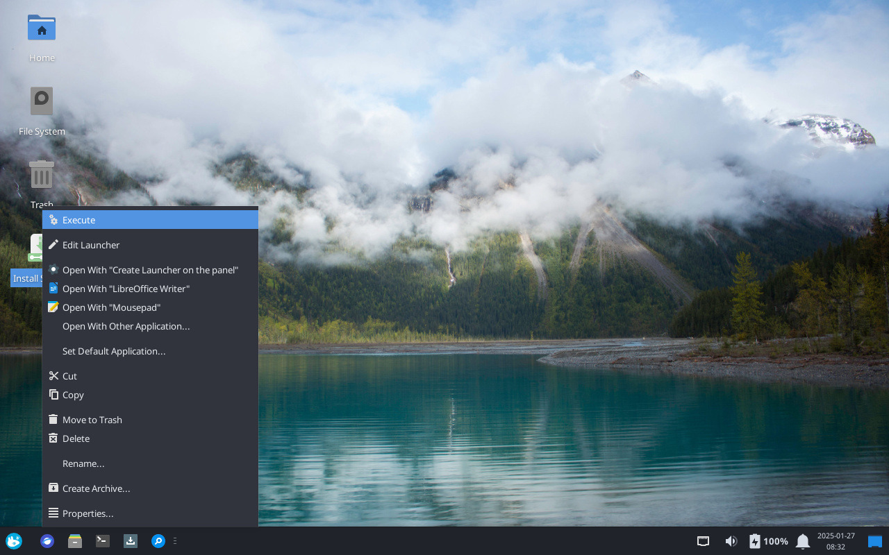 1. 概要 インストール手順は、「Solus - 4.7 - 共通事項」に記述しておりますので、ご参照ください。 2. インストール 「XFCE」の場合は、デスクトップ上のインストーラのアイコンを右クリックして 「Execute」で、インストーラを起動します。