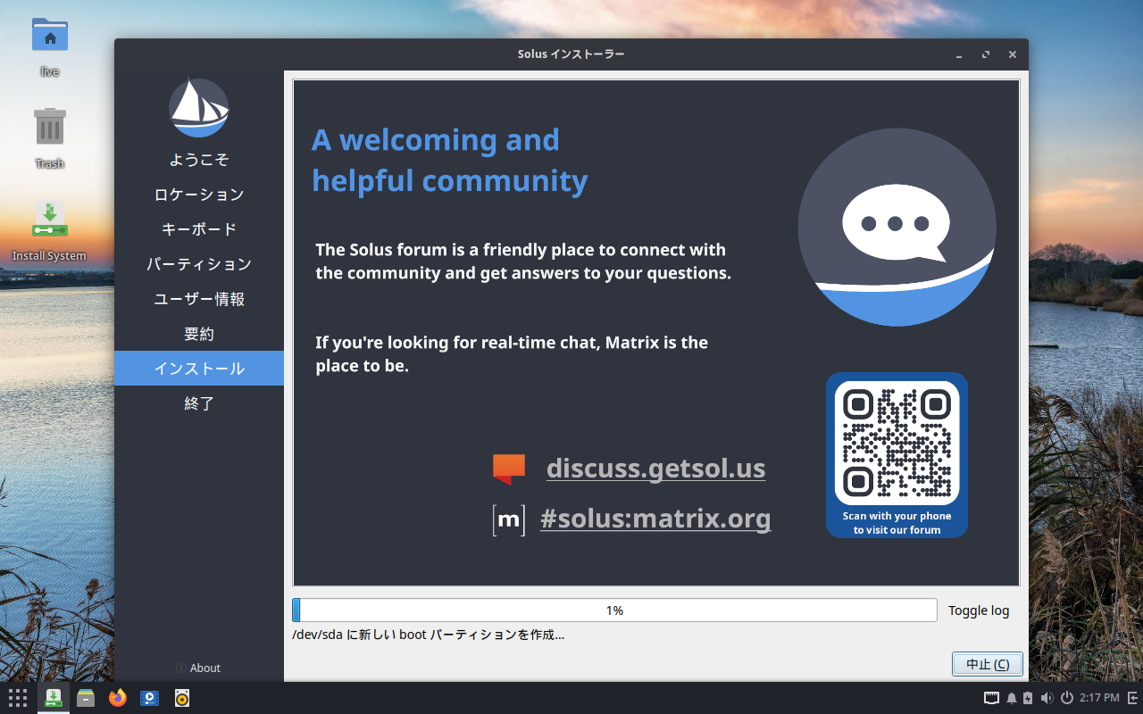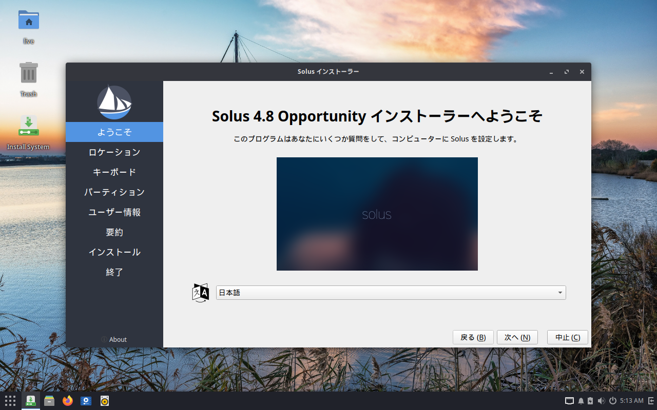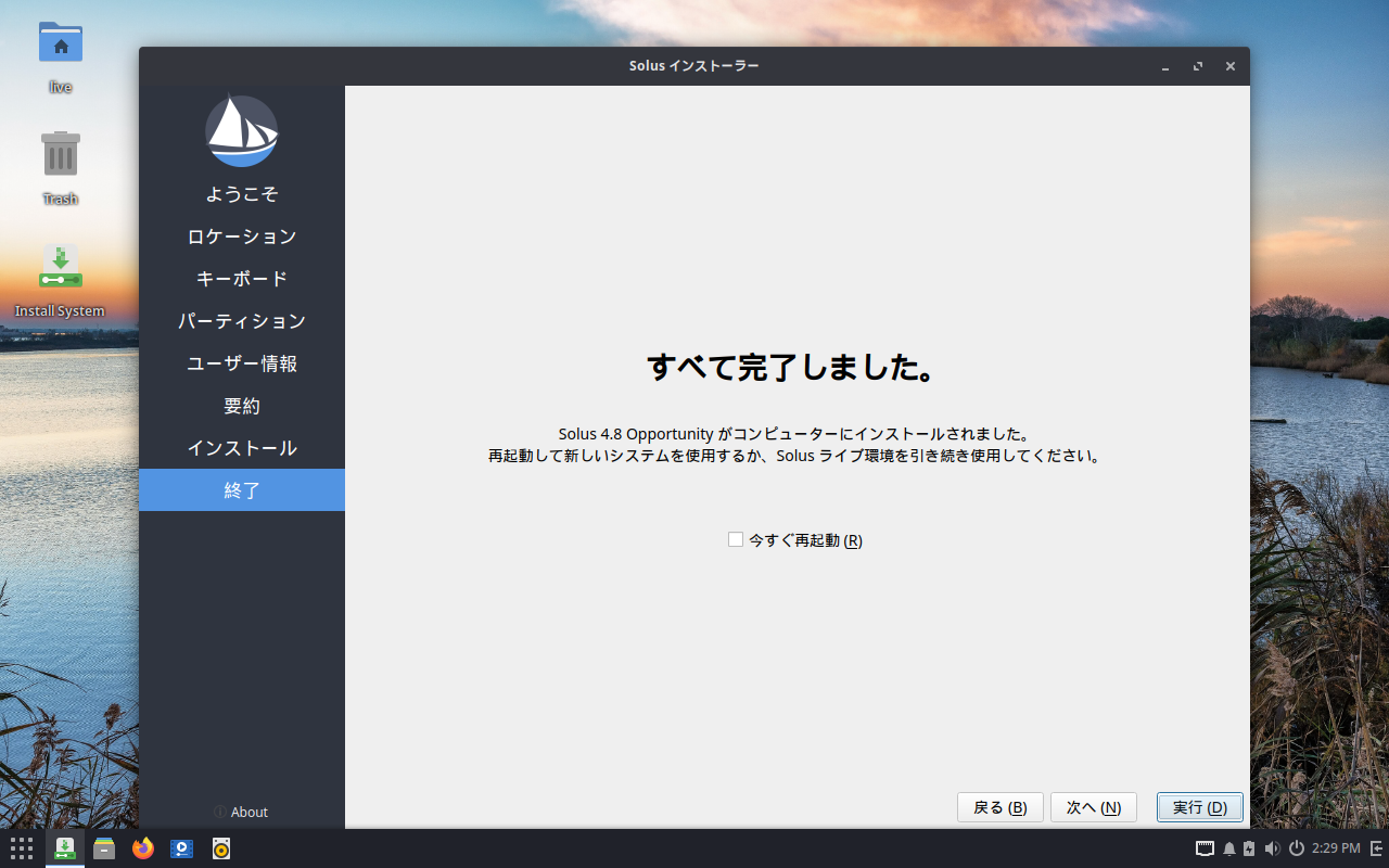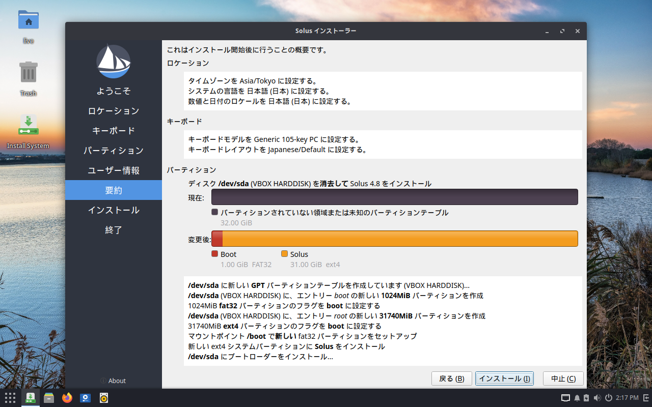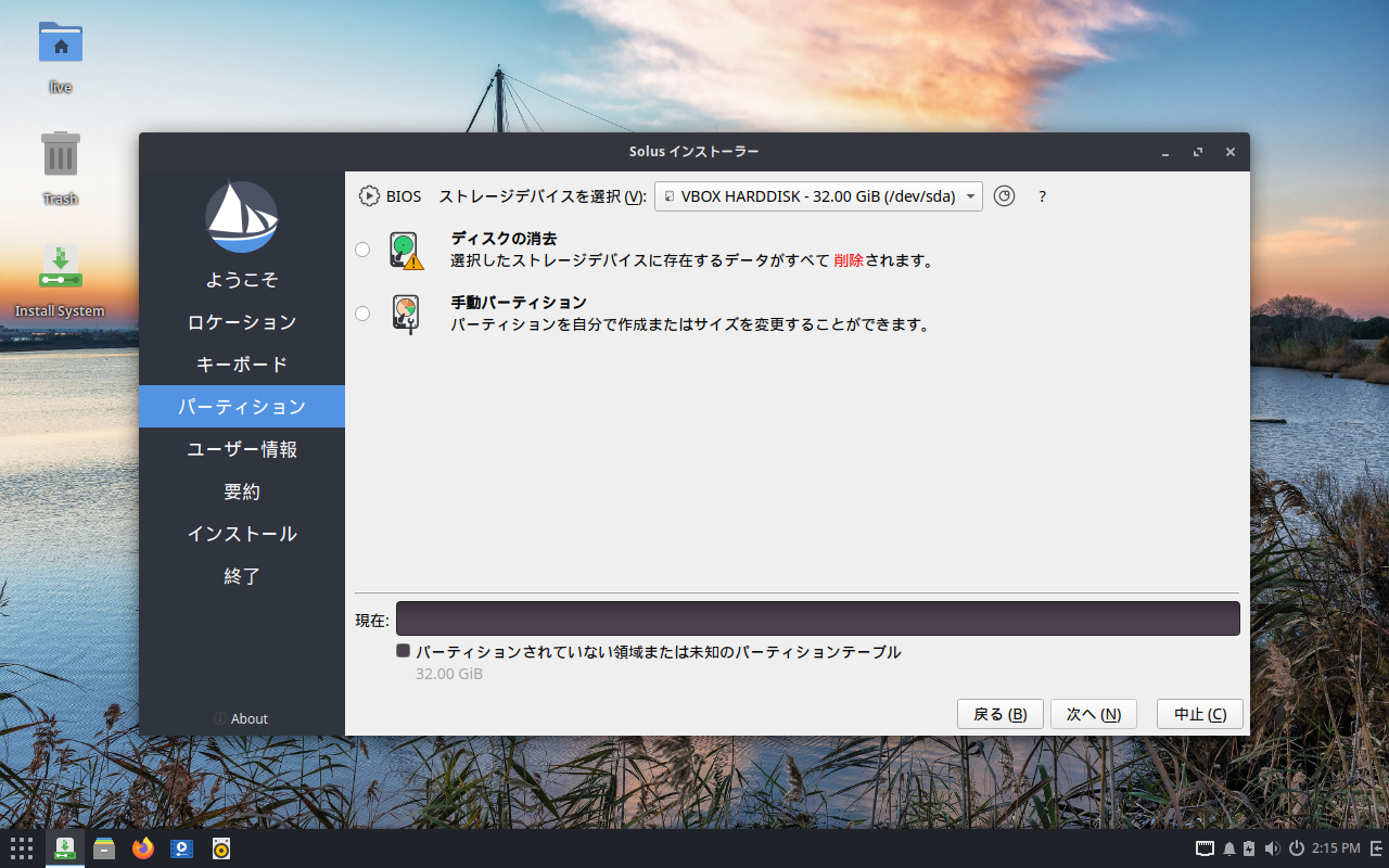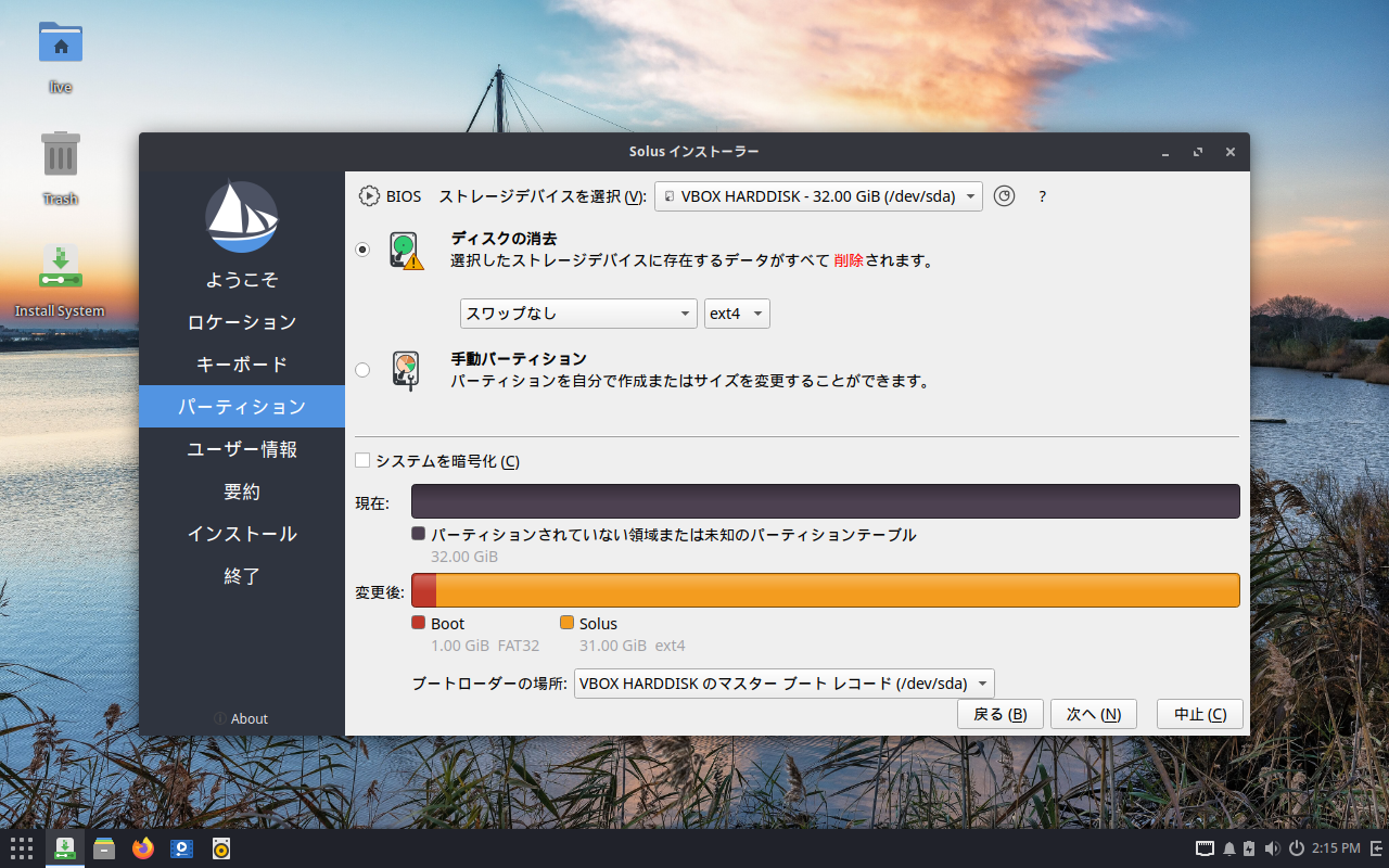 以下は、「Solus 4.8 BUDGIE」を「VirtualBox 7.2.4」上にインストールしたものです。