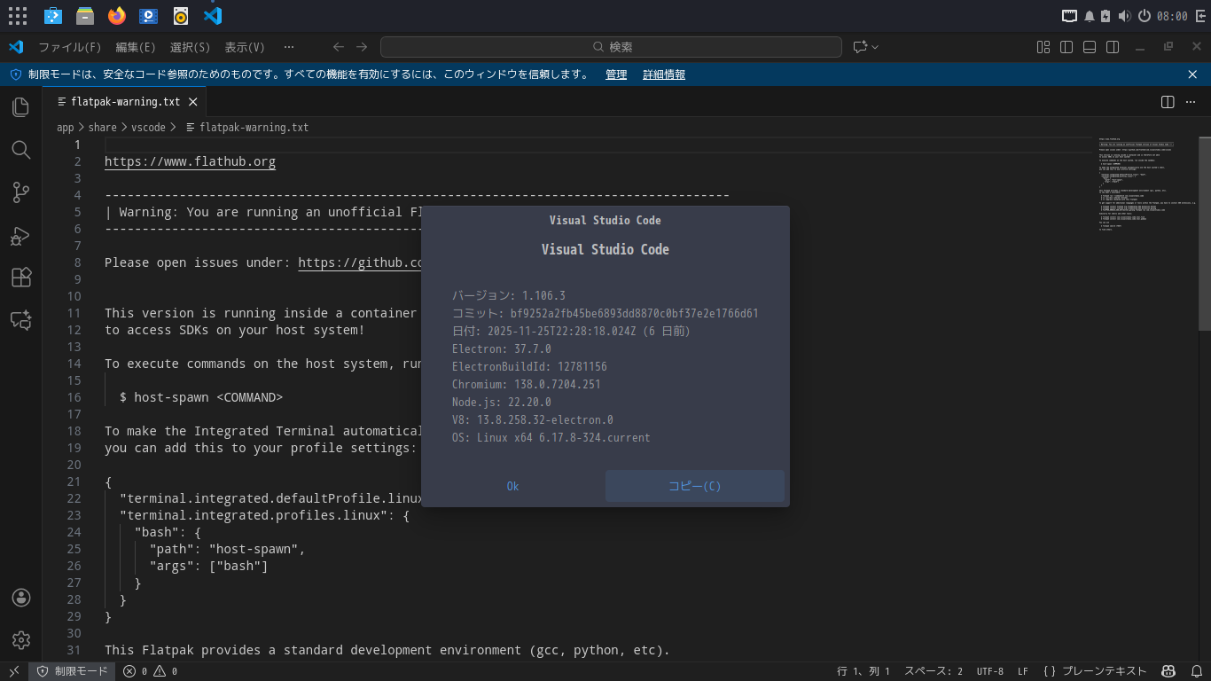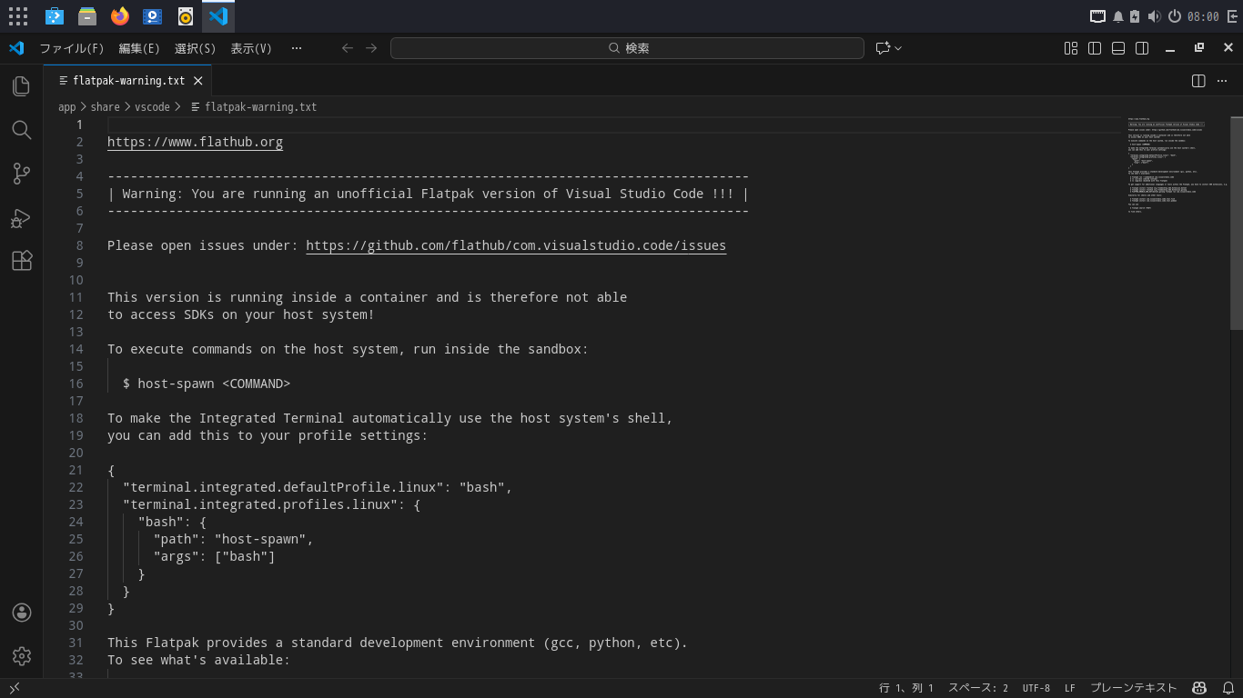 1. 概要 開発環境として「Vsiual Studio Code」を使用します。 2. インストール 「Discover」で、「vscode」を検索して、インストールします。 3. 起動 「スタート」→「Programming」→「Vsiual Studio Code」