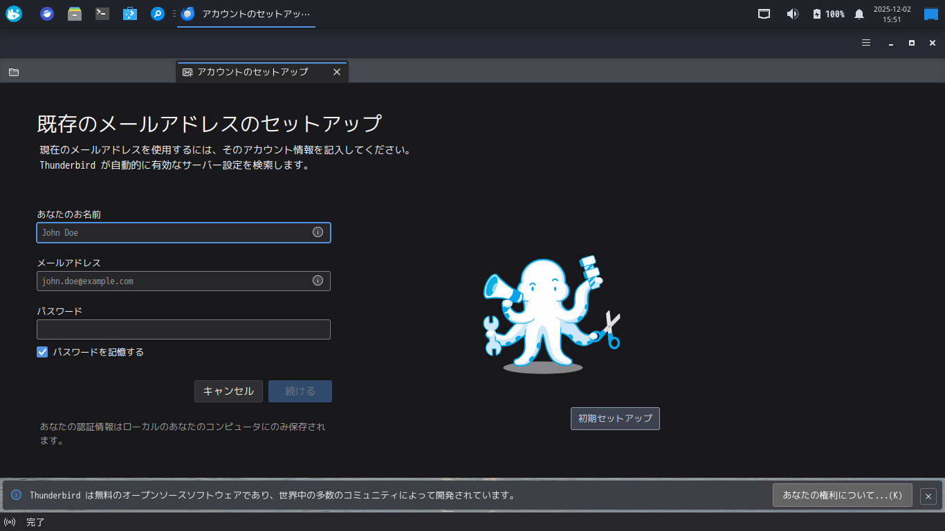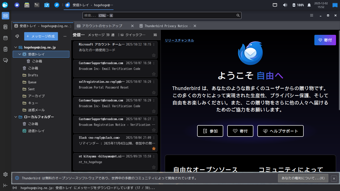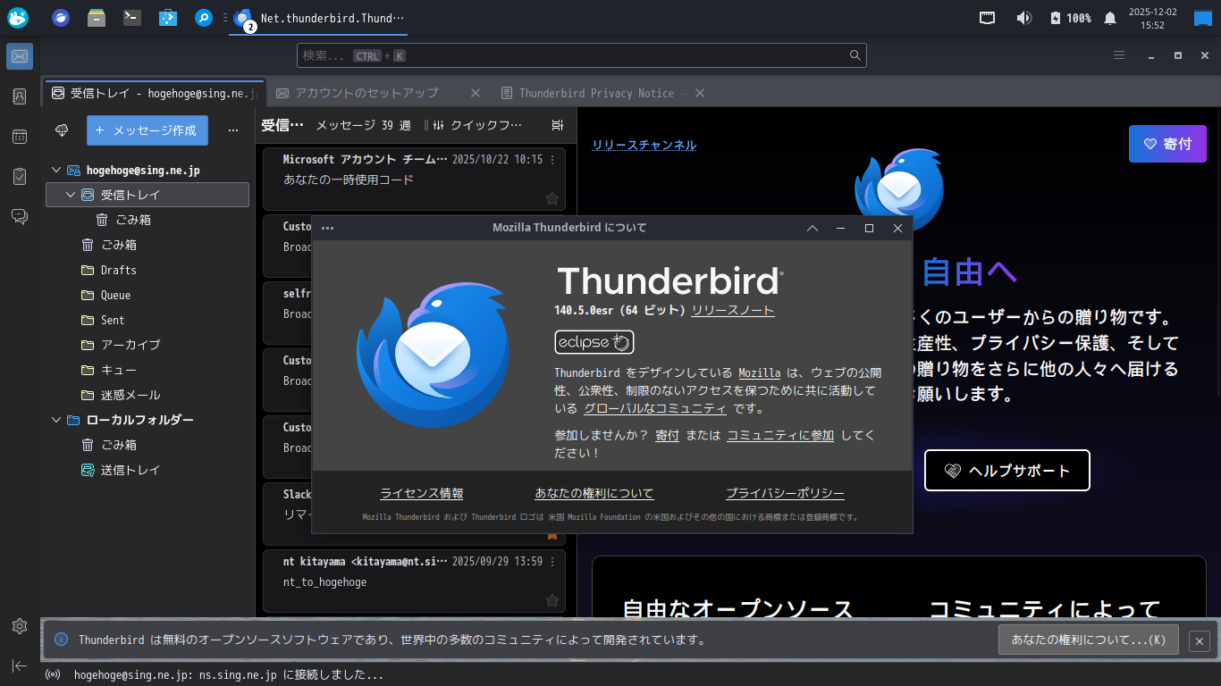 初回起動時は、「メールアカウント設定」から始まります。 起動直後に、受信トレイを開いた状態です。 2025年12月2日の時点で、下記のバージョンでした。 操作方法等は「メール クライアント ソフト - Thunderbird」でどうぞ。 |