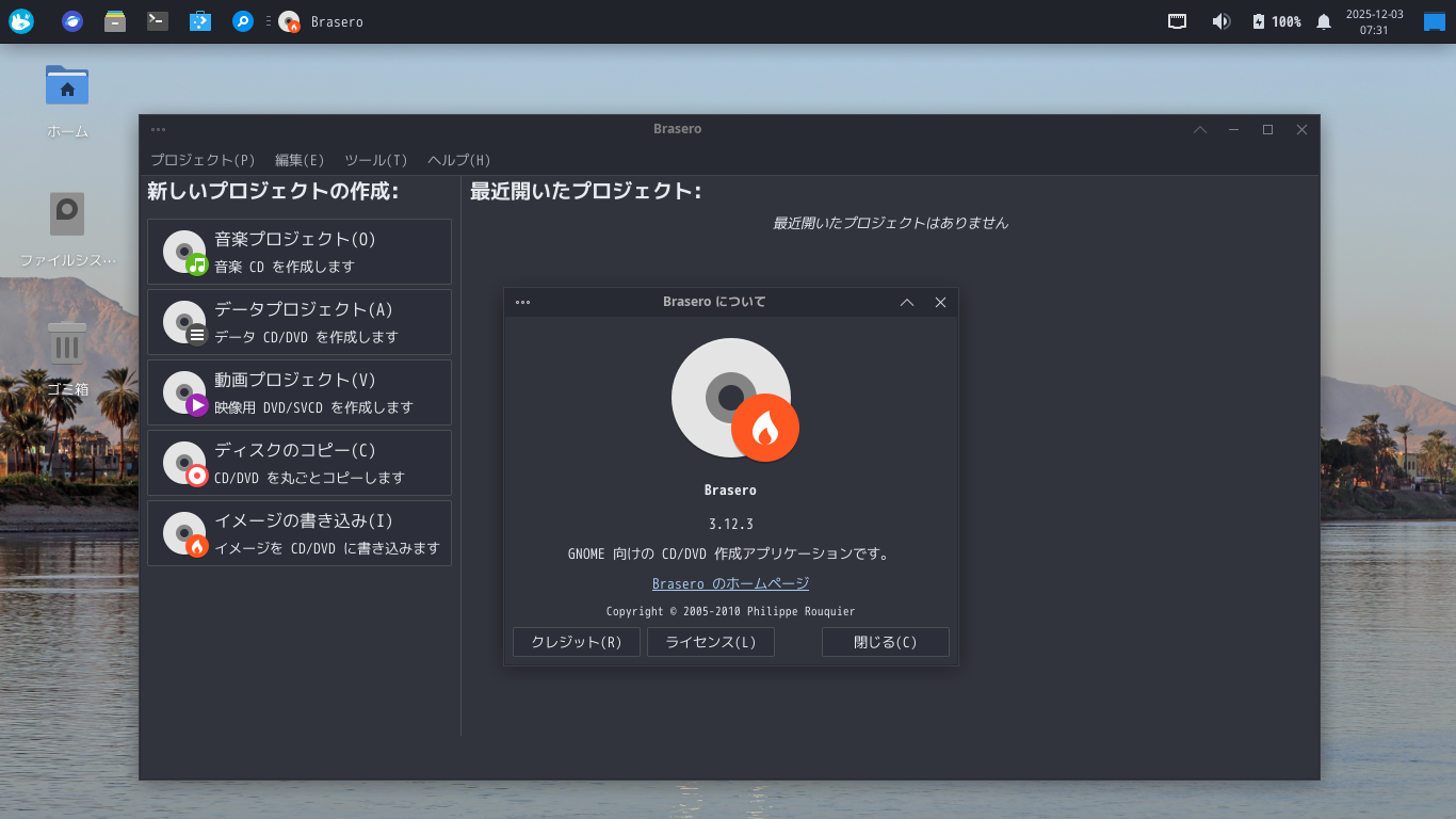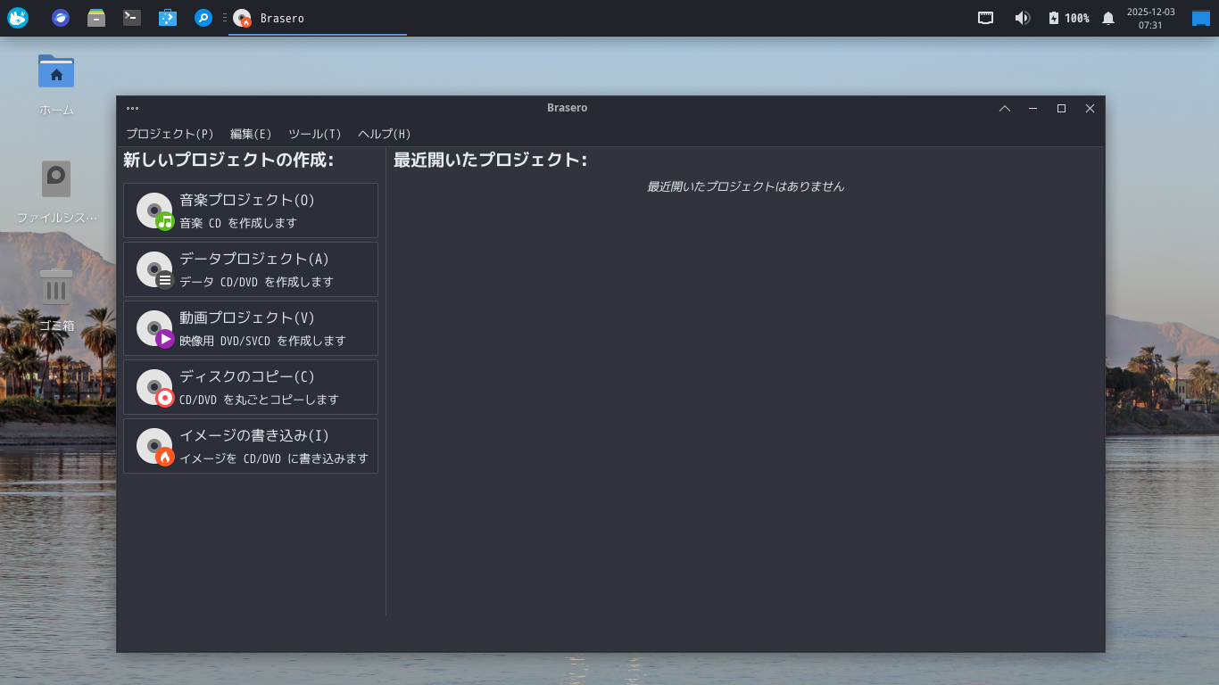 1. 概要 光ディスクライティングソフトとして、「Brasero」を使用します。 2. インストール 「Discover」で、「brasero」で検索して、インストールします。 3. 起動 「スタート」→「マルチメディア」→「Brasero」