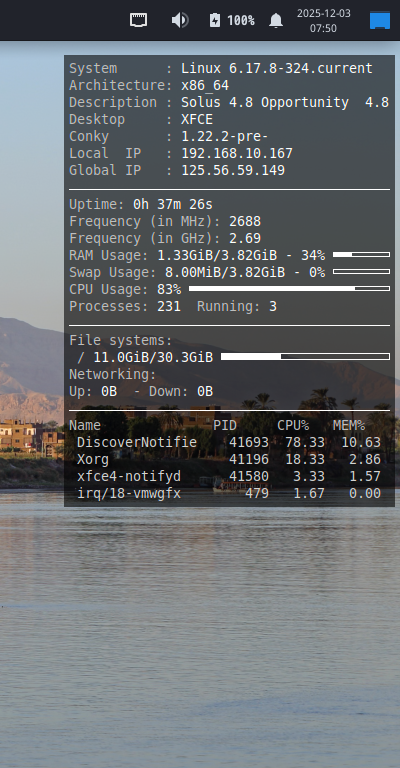 再ログイン後、デスクトップ右に、「Conky」の表示が現れます。