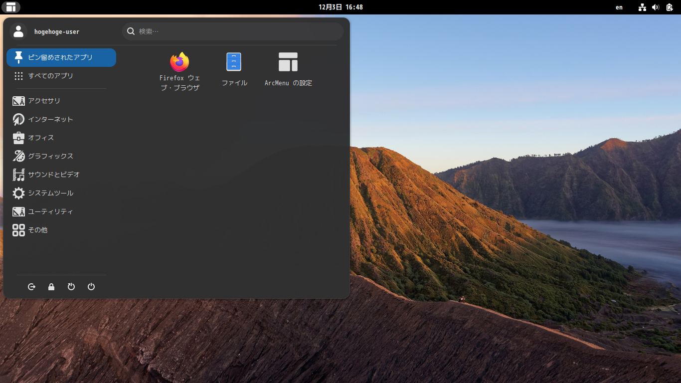 メニューは、「GNOME Shell 拡張機能」を使用して、「Arc Menu」をインストールしました。