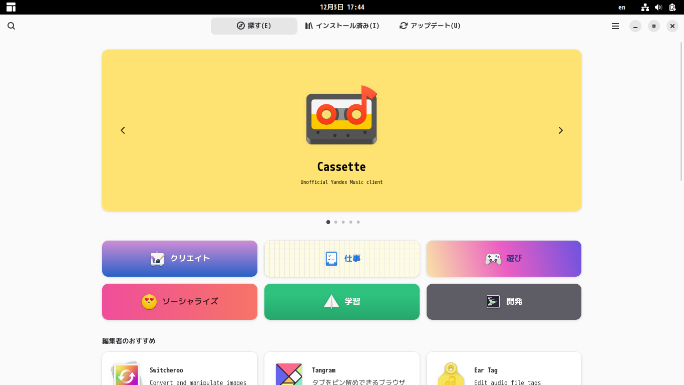 1. 概要 パッケージ管理フロントエンドとして「gnome-software」がインストールされています。 2. 起動 「スタート」→「システムツール」→「ソフトウェア」