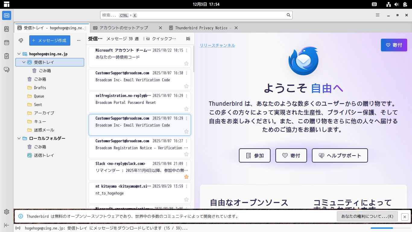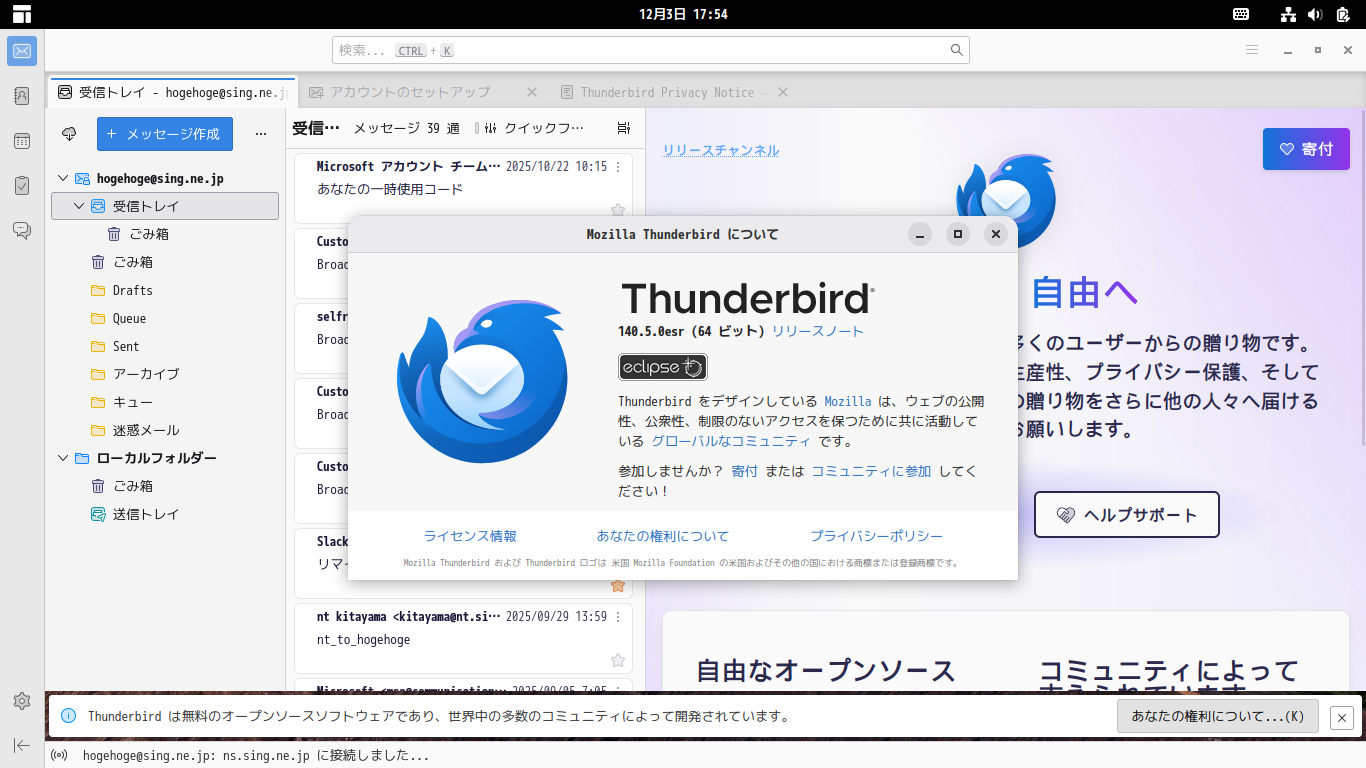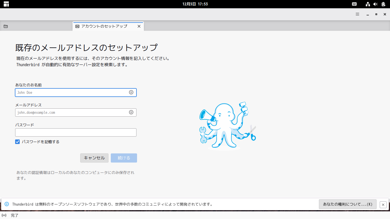 初回起動時は、アカウントの設定から始まります。 起動直後の状態です。 2025年12月3日の時点で、下記のバージョンでした。 操作方法等は「メールクライアント - Thunderbird」でどうぞ。 |