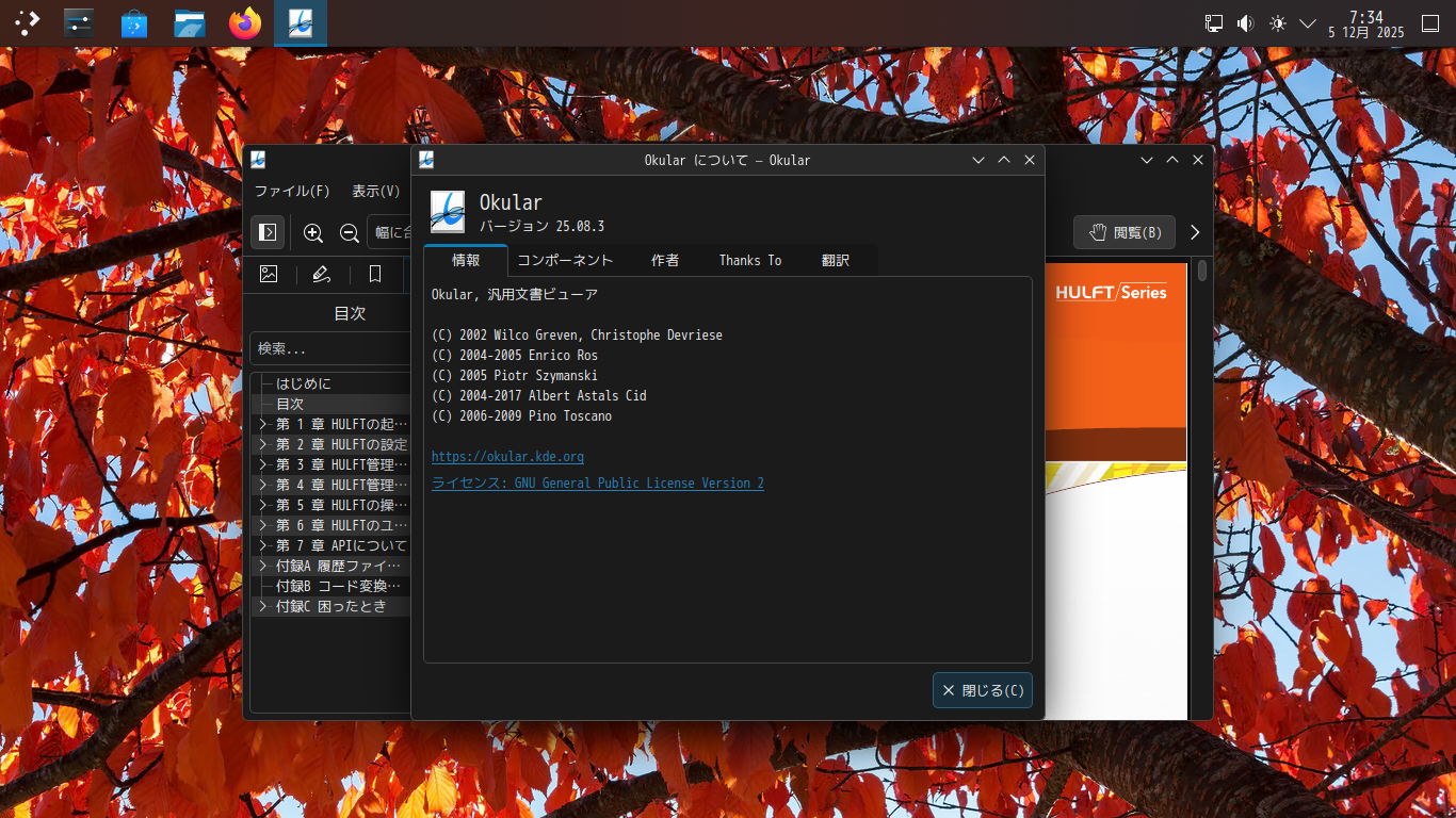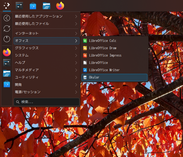 1. 概要 ドキュメントビューアとして、「Okular」を使用します。 「Okular」は、デフォルトでインストールされています。 2. 起動 「スタート」→「オフィス」→「Okular」