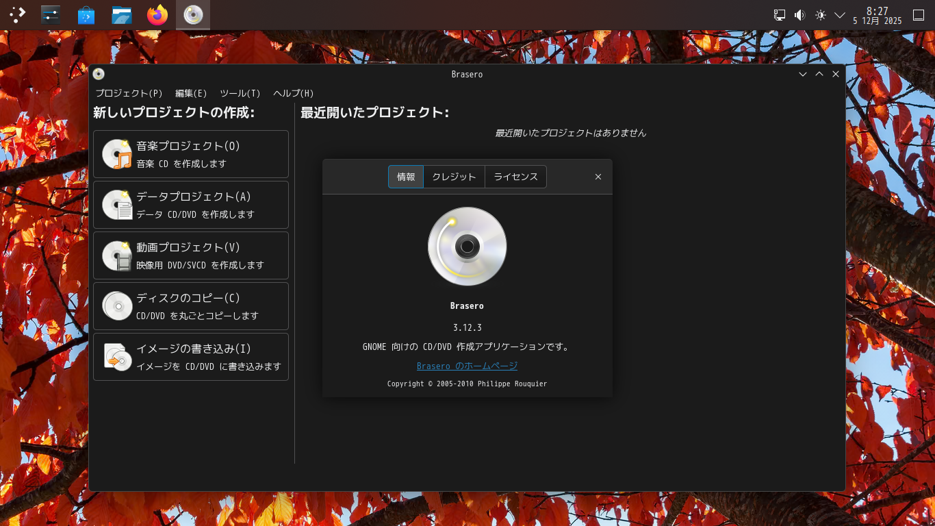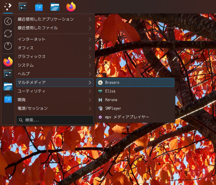 1. 概要 光ディスクライティングソフトとして、「Brasero」を使用します。 2. インストール 「Discover」で、「brasero」を検索して、インストールします。 3. 起動 「スタート」→「サウンドとビデオ」→「Brasero」