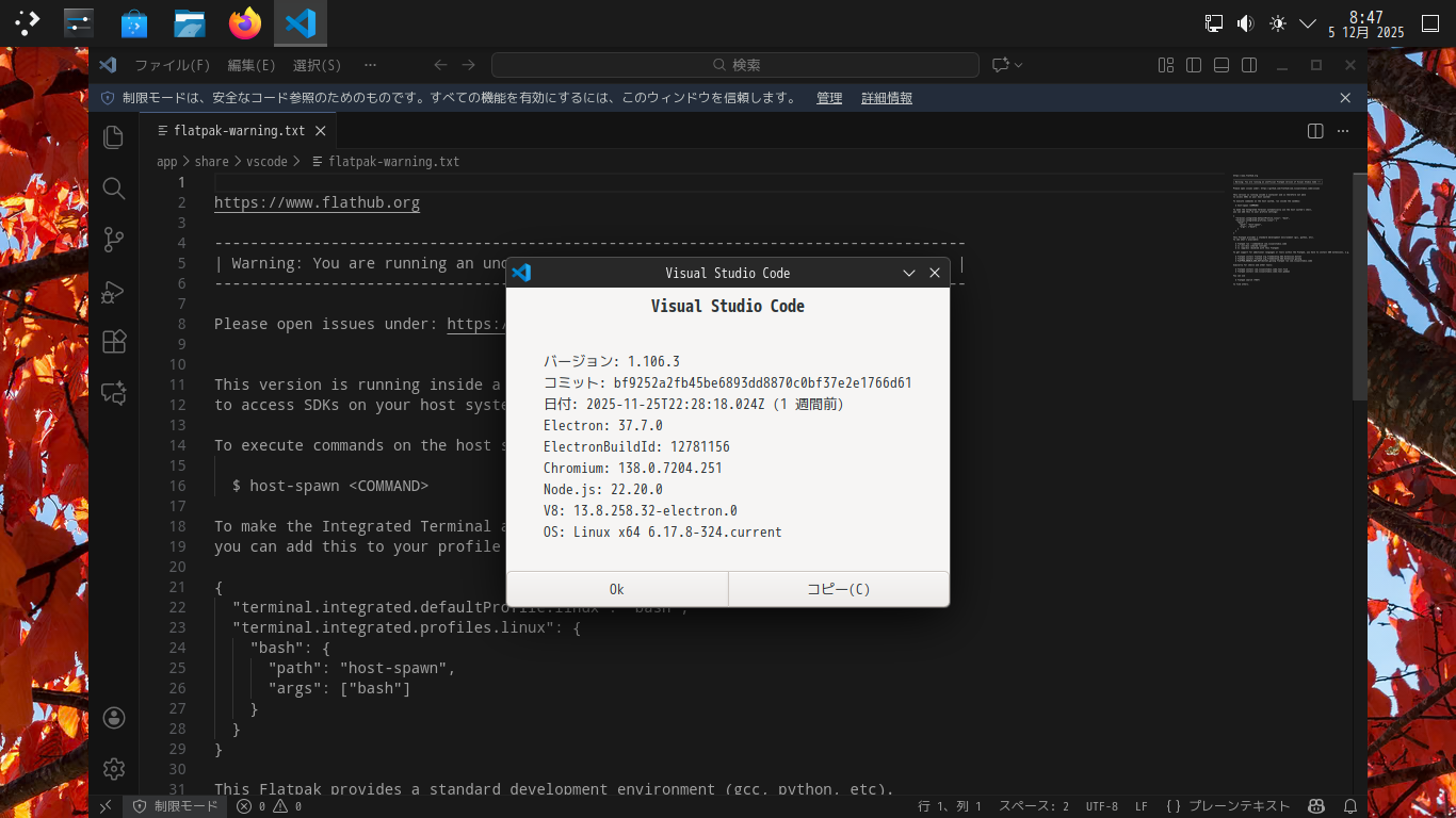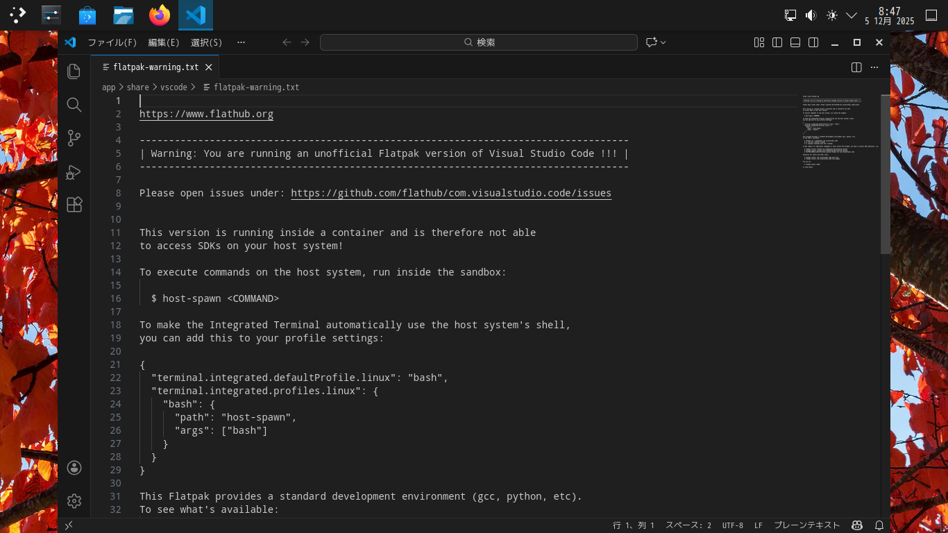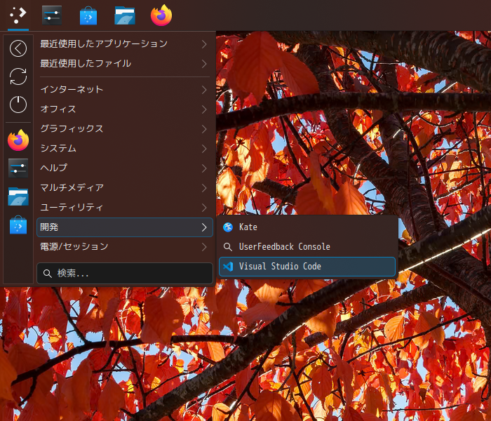 1. 概要 開発環境として「Vsiual Studio Code」を使用します。 2. インストール 「Discover」で、「vscode」を検索して、インストールします。 3. 起動 「スタート」→「開発」→「Vsiual Studio Code」