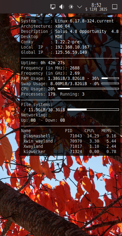 再ログイン後、デスクトップ右に、「Conky」の表示が現れます。