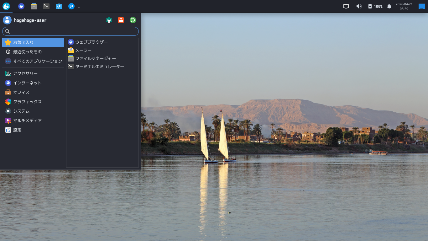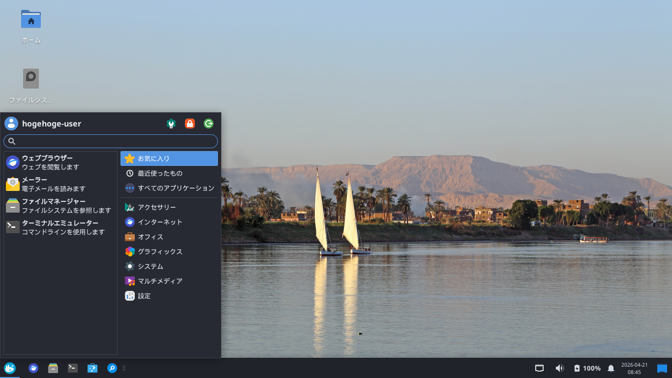 フォントのインストール方法に関しては、「Solus - 4.9 - 共通事項」をご参照ください。 3. カスタマイズ前後 デフォルトのデスクトップ・メニューです。