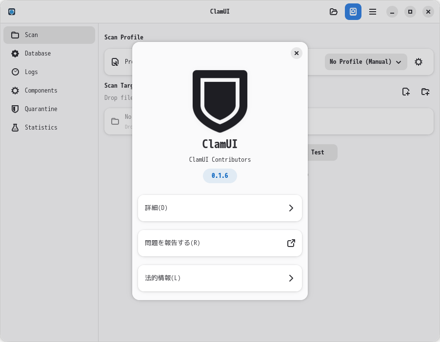 操作方法等は、「アンチウィルスソフト - ClamAV・ClamUI」をご参照ください。
