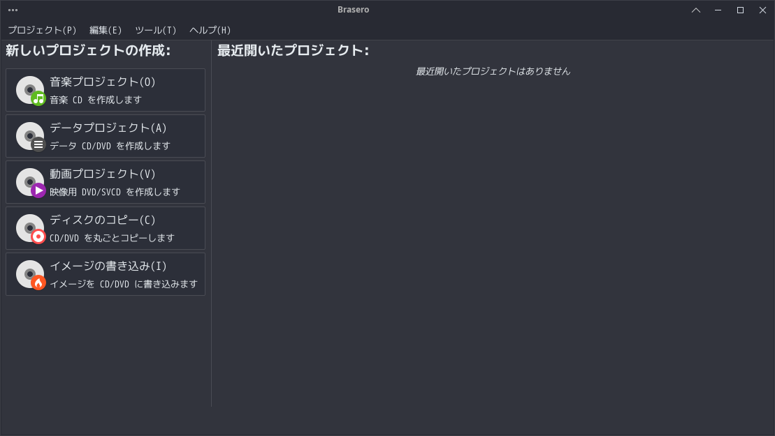 1. 概要 光ディスクライティングソフトとして、「Brasero」を使用します。 2. インストール 「Discover」で、「brasero」で検索して、インストールします。 3. 起動 「スタート」→「マルチメディア」→「Brasero」