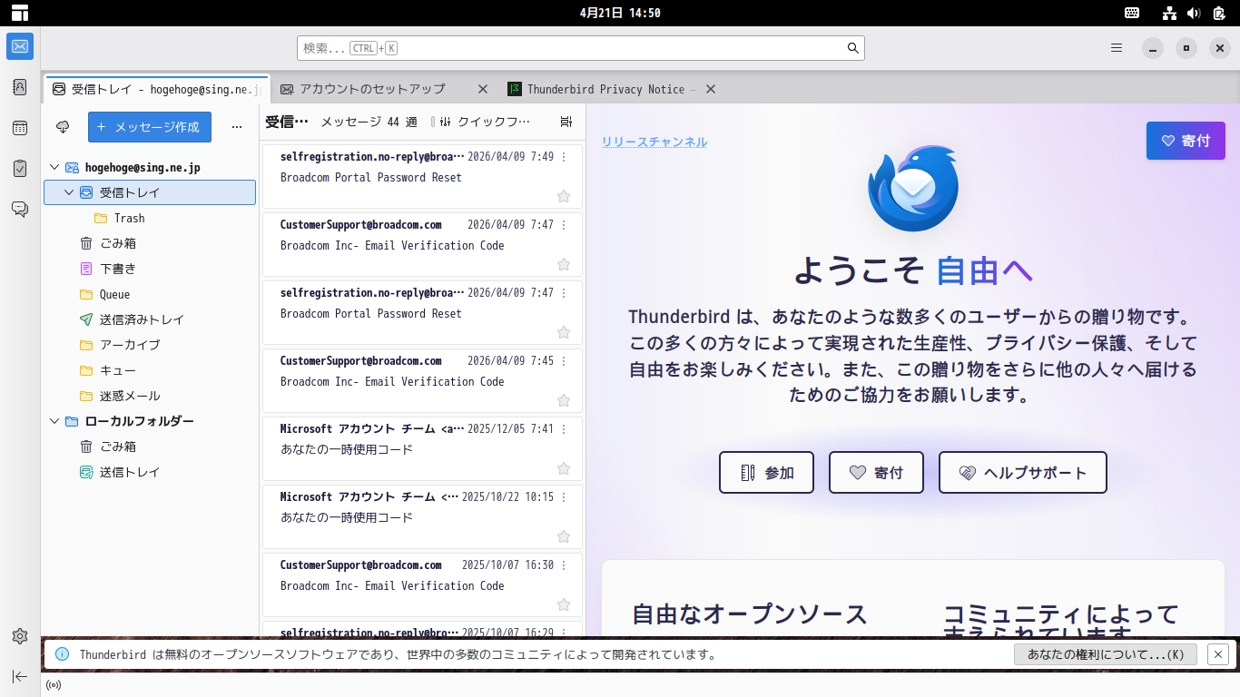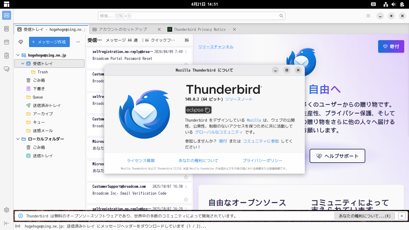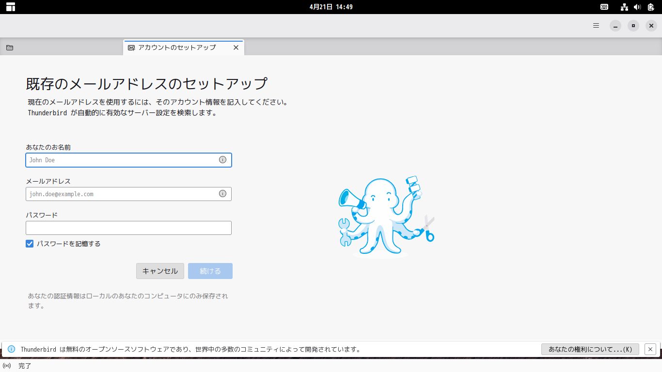 初回起動時は、「メールアドレスのセットアップ」から始まります。 起動直後の状態です。 2026年4月21日の時点で、下記のバージョンでした。 操作方法等は「メールクライアント - Thunderbird」でどうぞ。 |