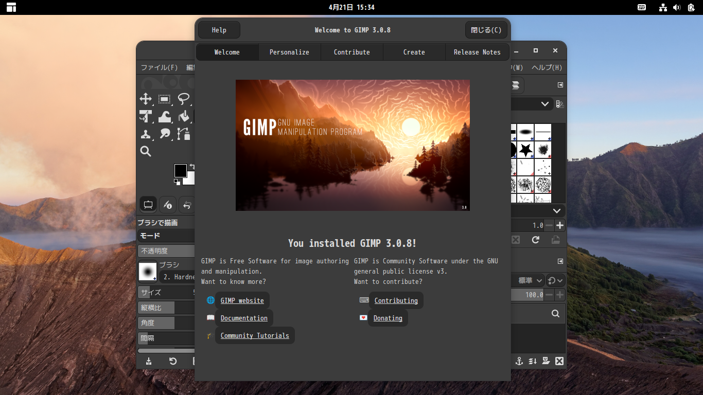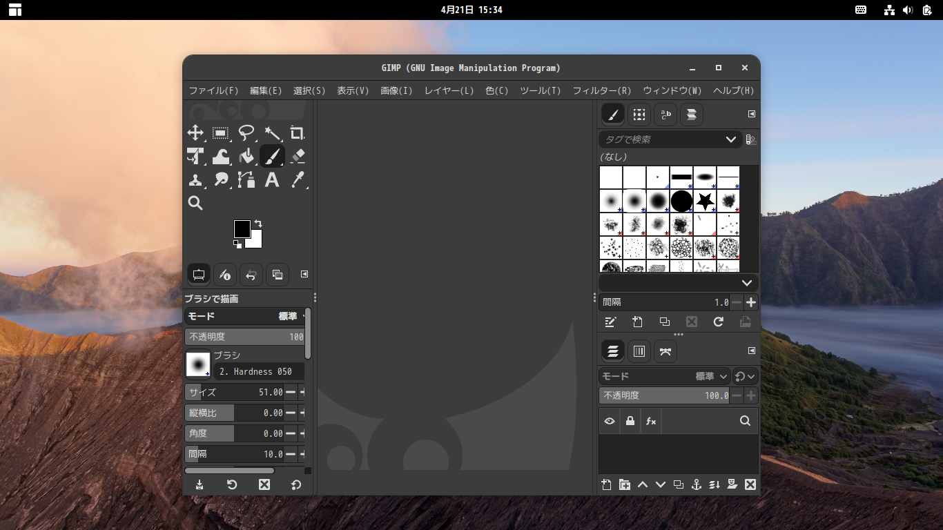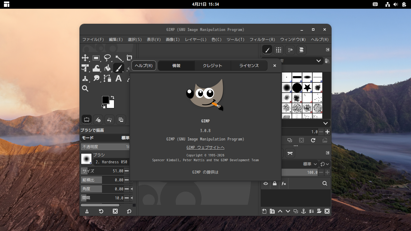 「閉じる」 起動直後の状態です。 2026年4月21日の時点で、下記のバージョンでした。 操作については、「画像編集ソフト - GIMP」に掲載しています。 上記は簡単なものですので、詳細なものがほしい方は、各所に初歩の手引きから応用編までありますので、そちらを参考にしてください。 |