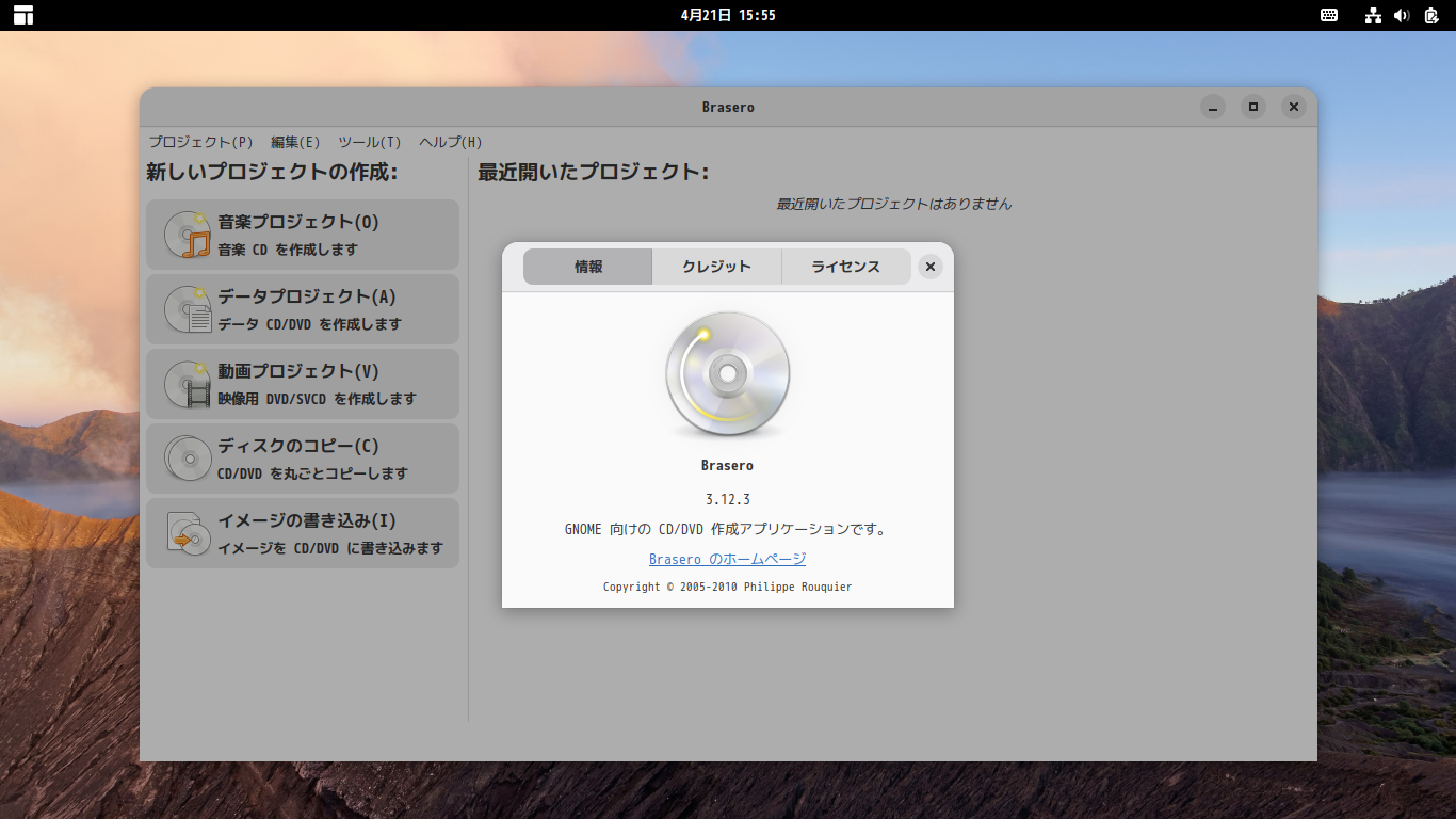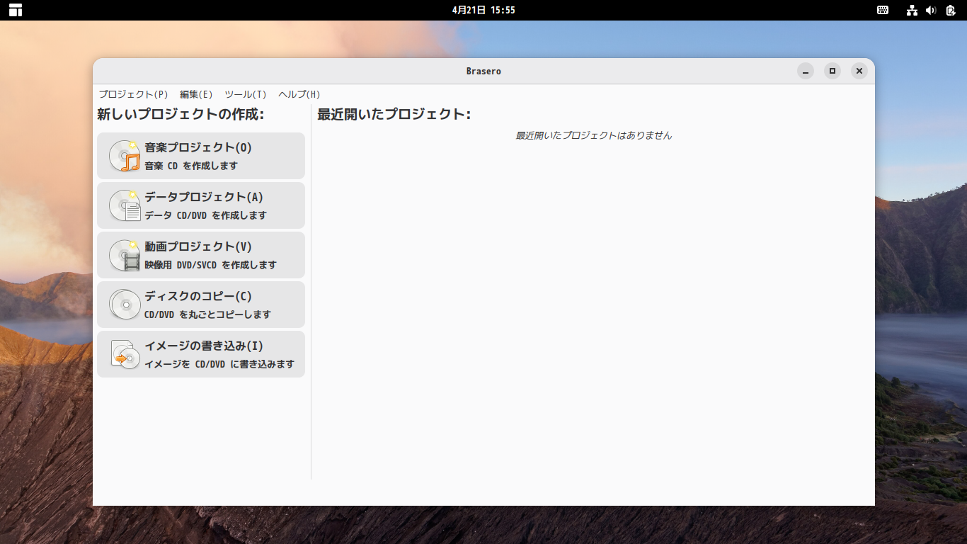 1. 概要 光ディスクライティングソフトとして「Brasero」を使用します。 2. インストール 「ソフトウェア」で、「brasero」を検索して、インストールします。 3. 起動 「スタート」→「サウンドとビデオ」→「Brasero」