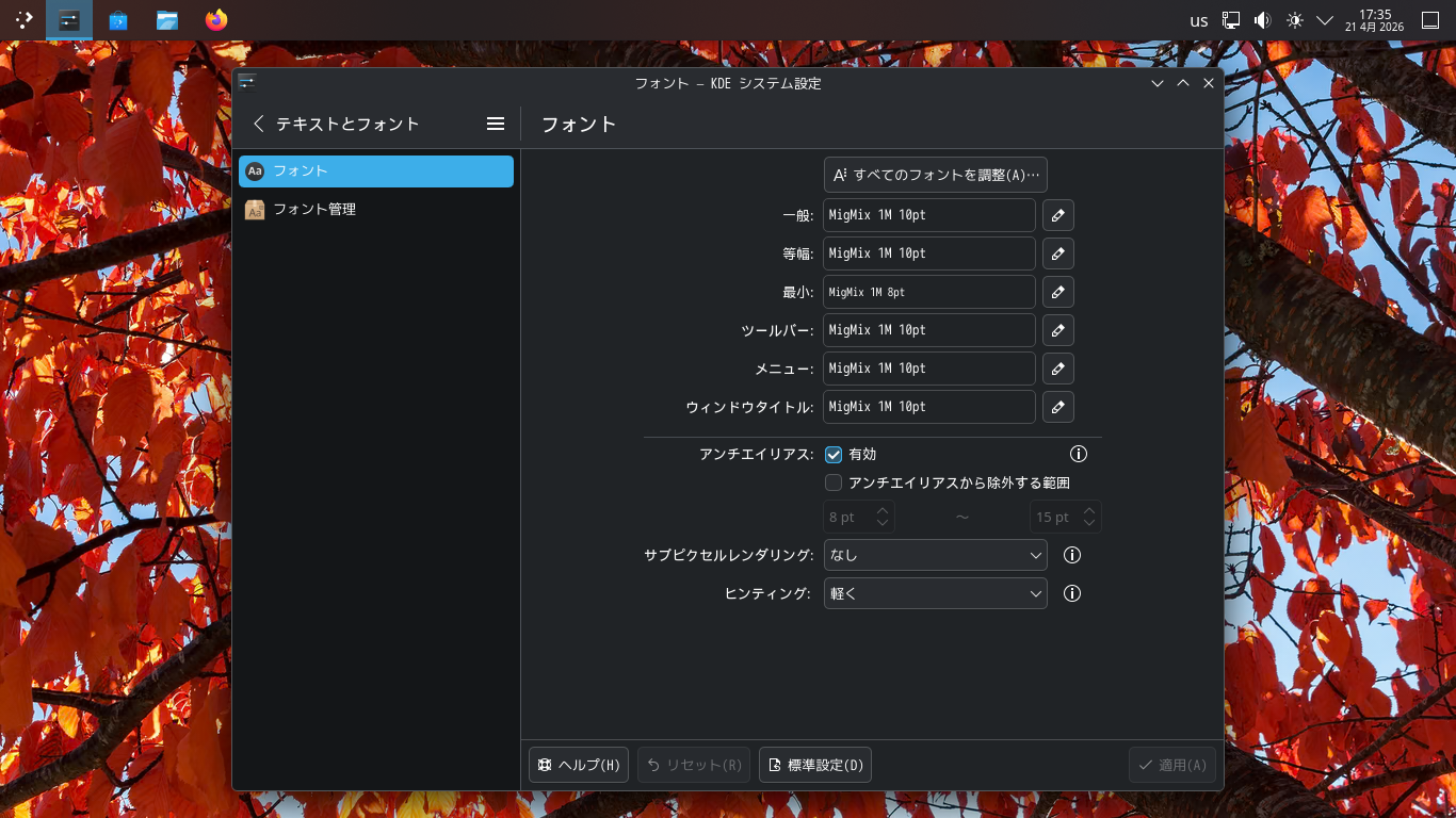 「KDE」の共通的な操作やカスタマイズ方法に関しては、「KDE - 共通事項」をご参照ください。 本プラットフォームでは、下記の項目を適用しました。 ・スクリーンロック ・メニュー ・フォント ・パネル ・解像度 ・キーボードレイアウト ・ログアウト時の確認 画像に関して「VirtualBox」とクリップボードの共有ができませんので、本章の画面キャプチャは、ほとんど全画面になります。 フォントは、下記を設定しました。