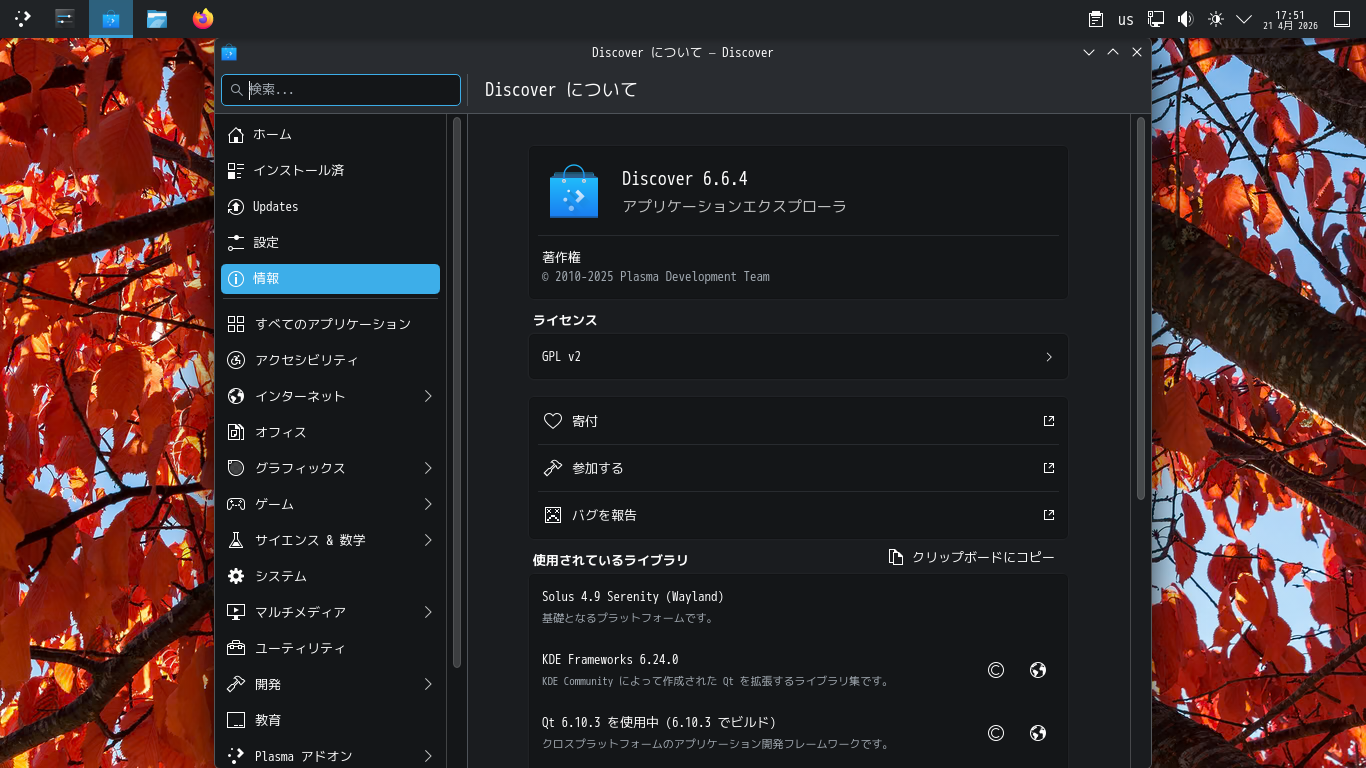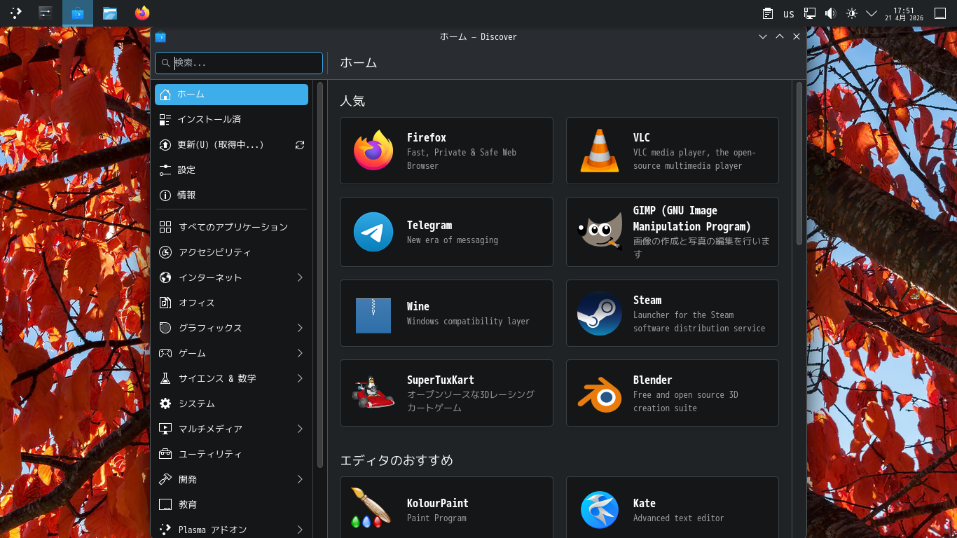 1. 概要 パッケージ管理フロントエンドとして「Discover」がインストールされています。 前回は、デスクトップ上の記述が、メニューでは「solus-sc」、アプリケーション上の記述では「ソフトウェアセンター」となっているものがインストールされていたのですが。 2. 起動 「スタート」→「システム」→「Discover」