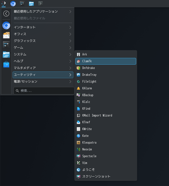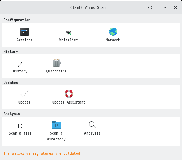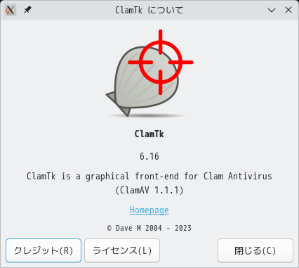起動直後の状態です。 2025年4月30日の時点で、下記のバージョンでした。 「アンチウィルスのシグネチャが時間切れです」の対応については、「デスクトップ環境構築 - 共通事項 - アンチウイルスソフト ClamTk」をご参照ください。 |