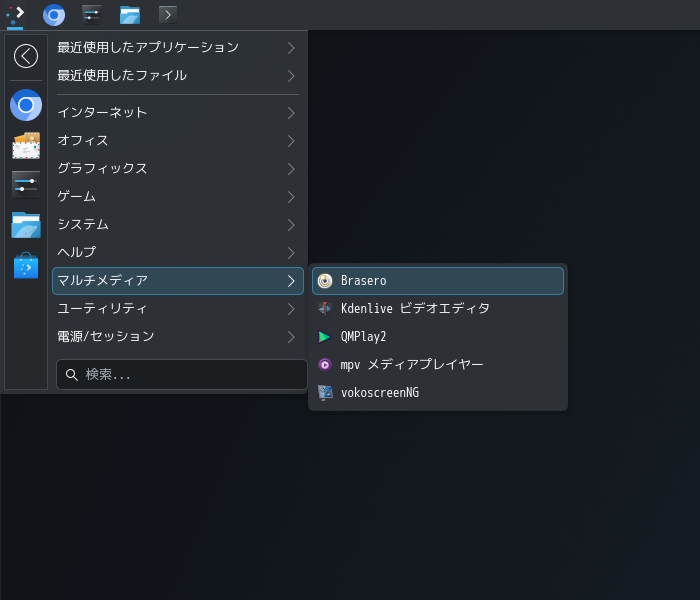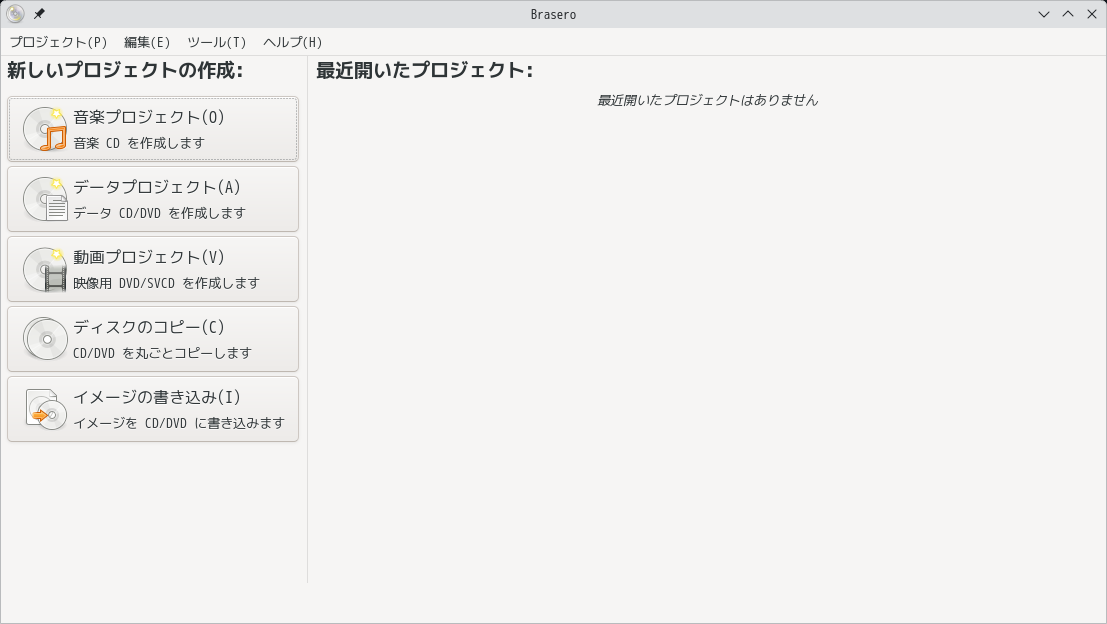 1. 概要 光ディスク(CD・DVD・Blu-ray)のライティングソフトとして、「Brasero」を使用します。 2. インストール 「Dnfdragora」で、「brasero」を検索して、インストールします。 3. 起動 「スタート」→「マルチメディア」→「Brasero」