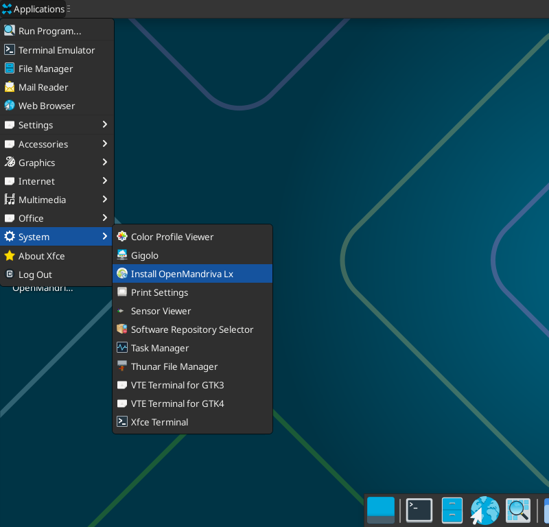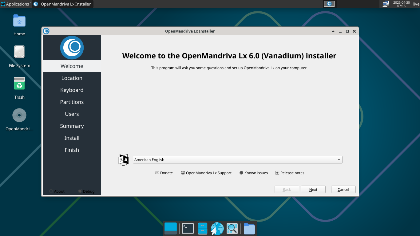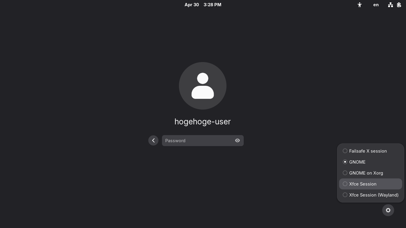 以降の手順は、「OpenMandriva - 6.0 - 共通事項」に記述してある、インストール手順と同様です。 ログイン画面が、表示されれれば、インストールは、完了です。 ログインマネージャは、「gdm」になっています。 ユーザをクリックして、右下の設定アイコン「」で。 「XFCE Session」を選択してログインすれば、「XFCE」のデスクトップへログインできます。 |