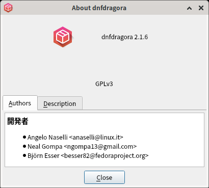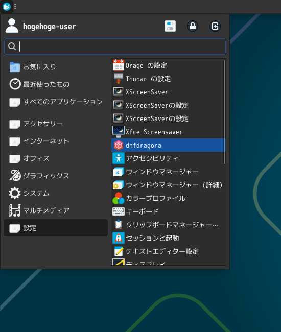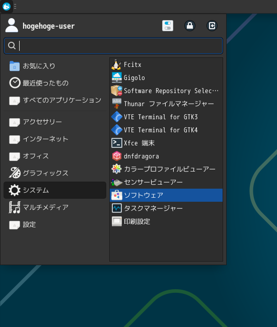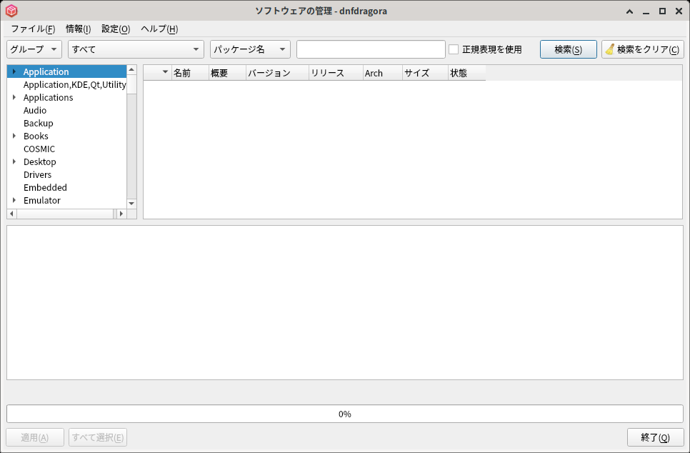 1. 概要 今回、「XFCE」には、パッケージ管理フロントエンドが、何もインストールされていませんでした。 「dnfdragora」と「gnome-software」をインストールして使用します。 操作等については、「Linux - 共通事項 - パッケージ管理フロントエンド」をご参照ください。 2. インストール 「root」ユーザ権限で。 dnf install -y dnfdragora 3. Dnfdragora 「スタート」→「システム」→「dnfdragora」