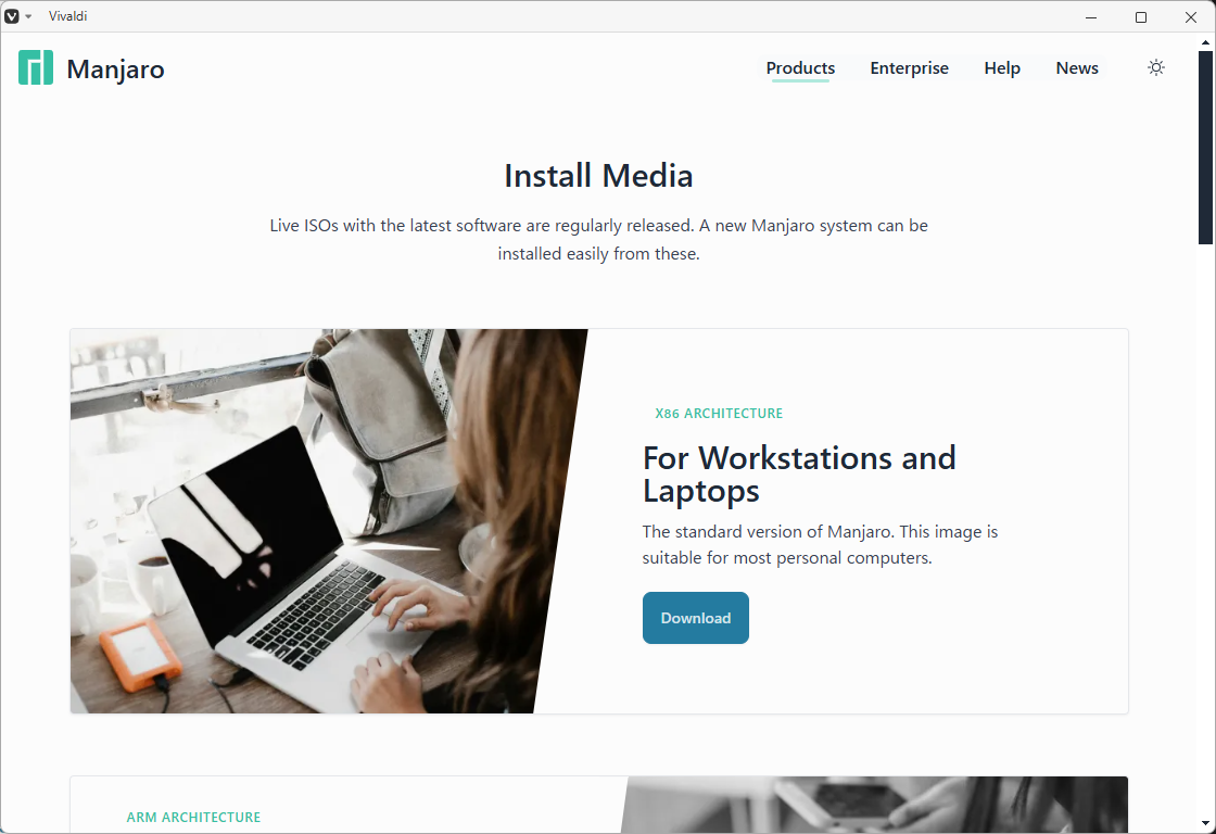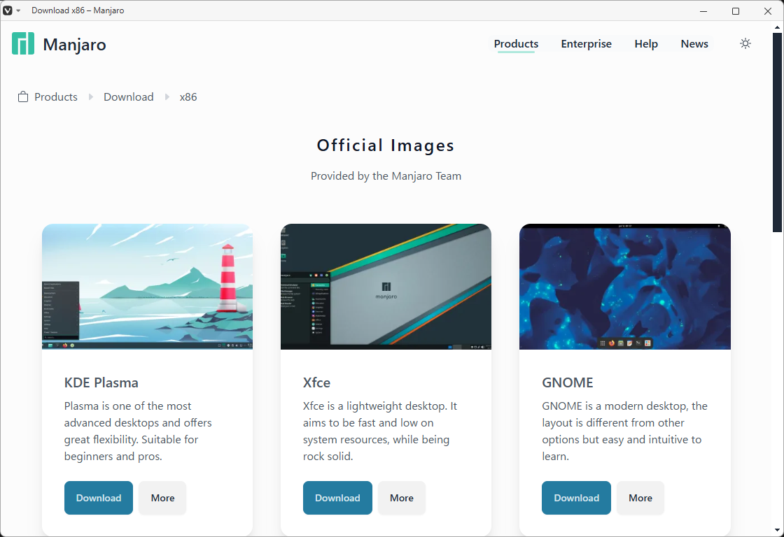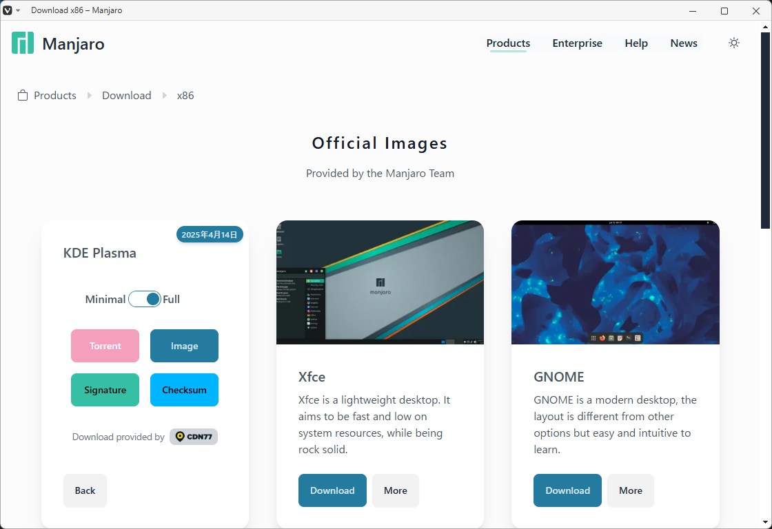 ここから下は、前ページと同じだな。 上の方に、「Official」版として、「KDE」「XFCE」「GNOME」が並んでいます。 下の方に、「Commnity」版として、「Cinnamon」「i3」「Sway」が並んでいます。 「Download」をクリックすると、「.iso」のダウンロードが開始されます。 「More」をクリックすると、「.torrent」「Minimal/Full」等を選択して、ダウンロードできます。 「Sway」は、別のページに飛んで、「.iso」のみをダウンロードできます。 |
