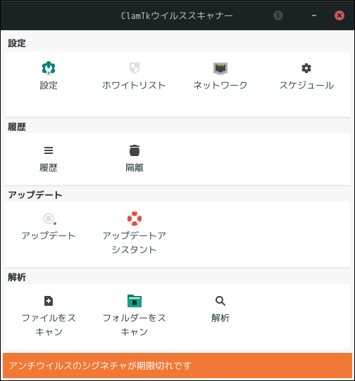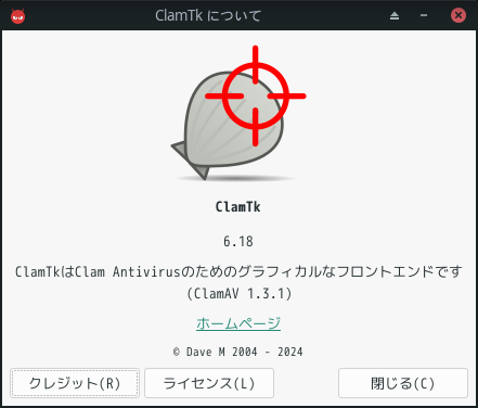 起動直後の状態です。 2024年12月9日の時点で、下記のバージョンでした。 操作方法については、「デスクトップ環境構築 - 共通事項 - ClamTk」をご参照ください。 |