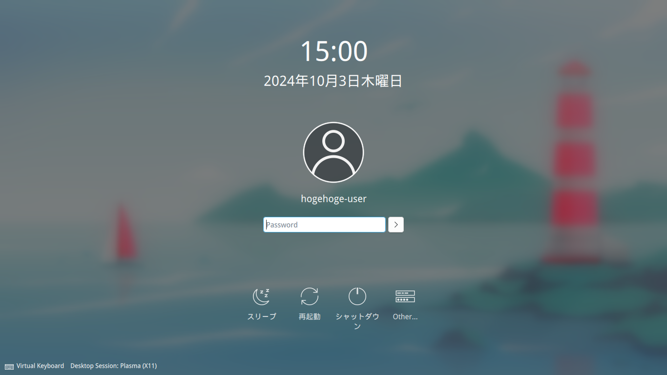 1. インストール インストール手順については、「Manjaro - 24.2 - 共通事項」をご参照ください。 ログイン画面が表示されれば、インストールは、完了です。