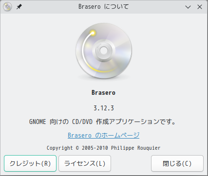 起動直後の状態です。 2024年12月10日の時点で、下記のバージョンでした。 操作方法等については、「デスクトップ環境構築 - 共通事項 - 光ディスクライティング」をご参照ください。 |