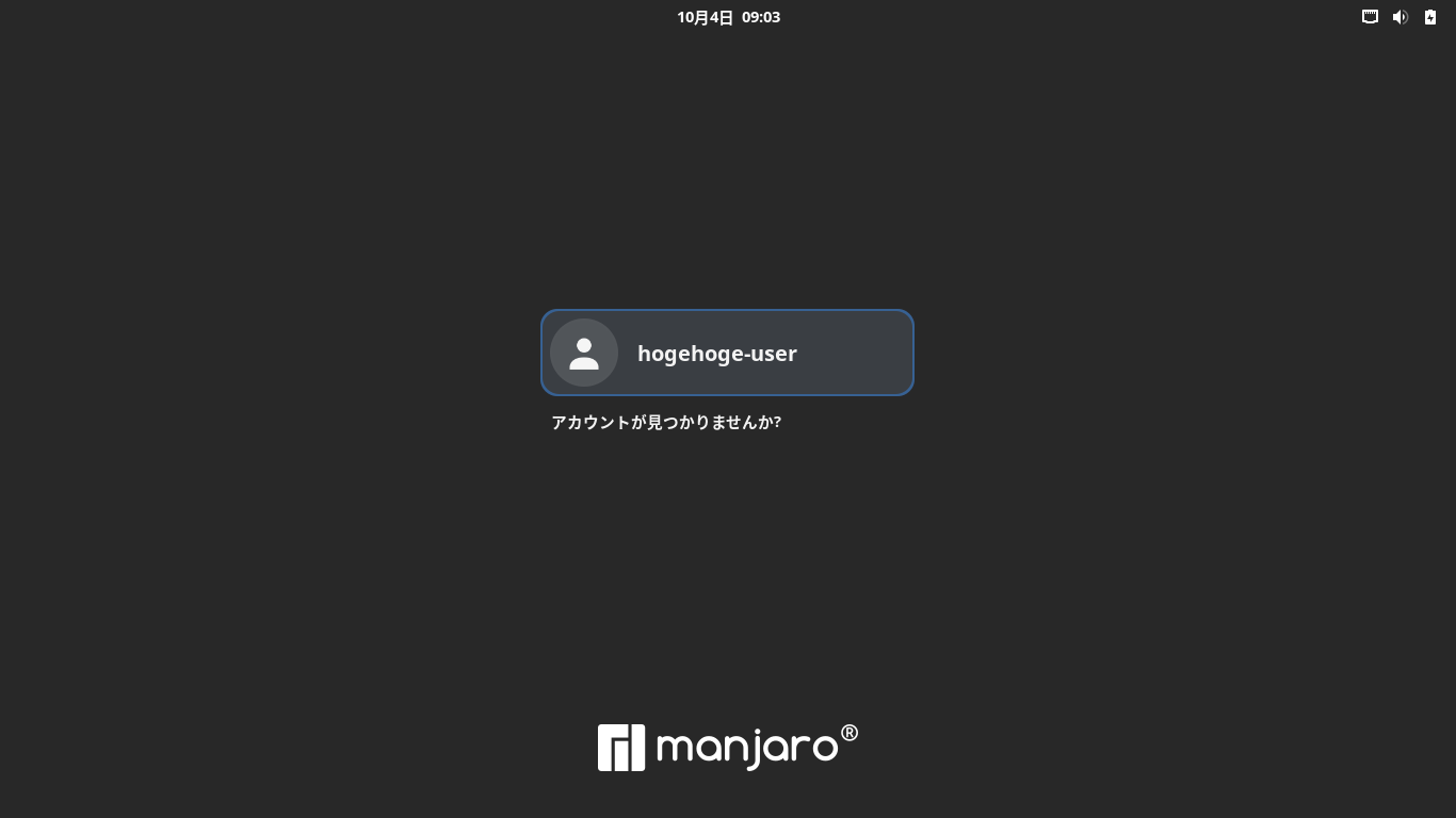 インストール手順については、「Manjaro - 24.2 - 共通事項」をご参照ください。  ログイン画面が表示されれば、インストールは完了です。