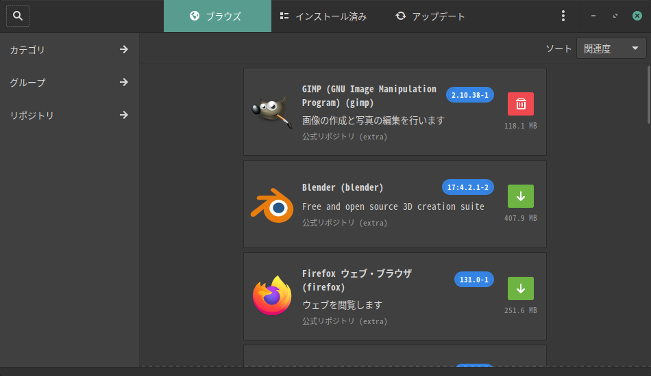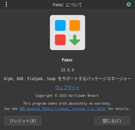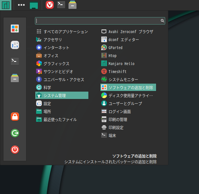 1. 概要 「Pamac」は、「Arch」系のパッケージ管理フロントエンドプログラムです。 操作等については、「Linux - 共通事項 - パッケージ管理フロントエンド」をご参照ください。 2. 起動 「スタート」→「システム管理」→「ソフトウエアの追加と削除」