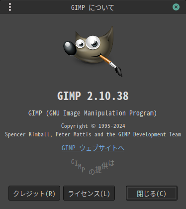 起動直後の状態です。 2024年10月7日の時点で、下記のバージョンでした。 操作については、「画像編集ソフト GIMP2」に掲載しています。 上記は簡単なものですので、詳細なものがほしい方は、各所に初歩の手引きから応用編までありますので、そちらを参考にしてください。 |