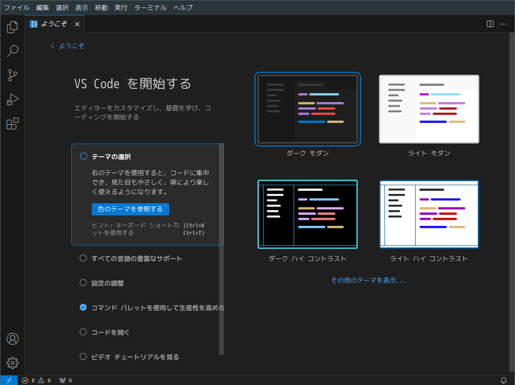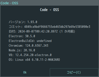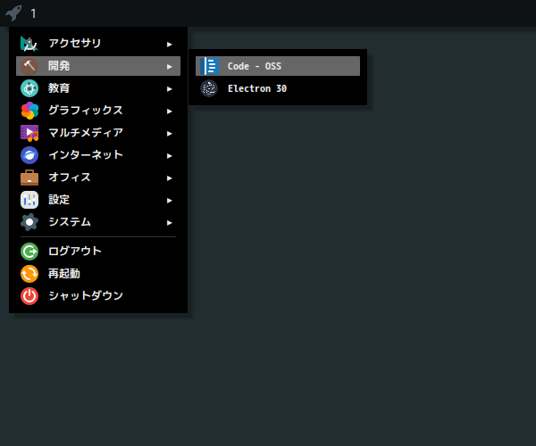 1. 概要 開発環境として、「Visual Studio Code」を使用します。 2. インストール 「root」ユーザ権限で。 yes | pacman -S vscode 3. 起動 「スタート」→「開発」→「Code - OSS」