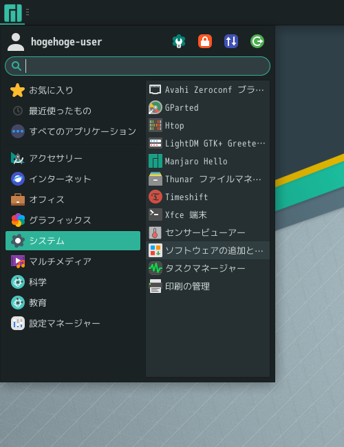 1. 概要 「Pamac」は、パッケージ管理フロントエンドプログラムです。 操作等については、「Linux - 共通事項 - パッケージ管理フロントエンド」をご参照ください。 2. 起動 「スタート」→「システム」→「ソフトウエアの追加と削除」