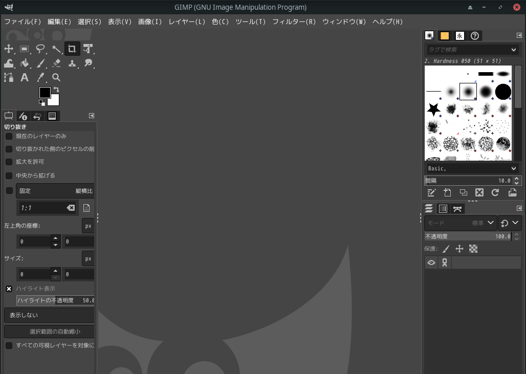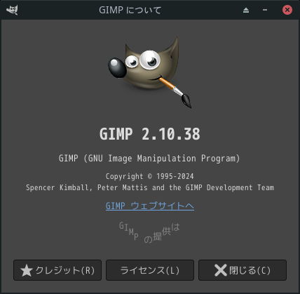 起動直後の状態です。 2024年12月9日の時点で、下記のバージョンでした。 操作については、「画像編集ソフト GIMP2」に掲載しています。 上記は簡単なものですので、詳細なものがほしい方は、各所に初歩の手引きから応用編までありますので、そちらを参考にしてください。 |