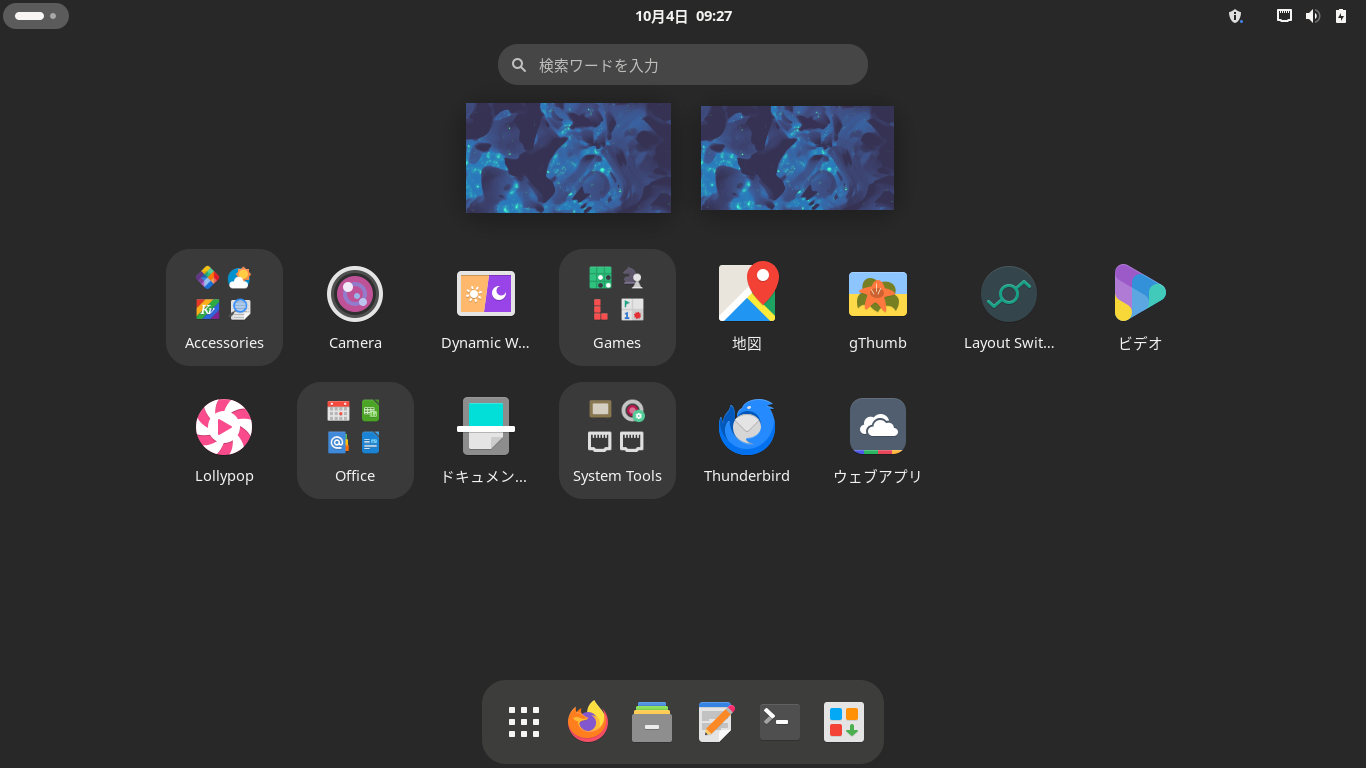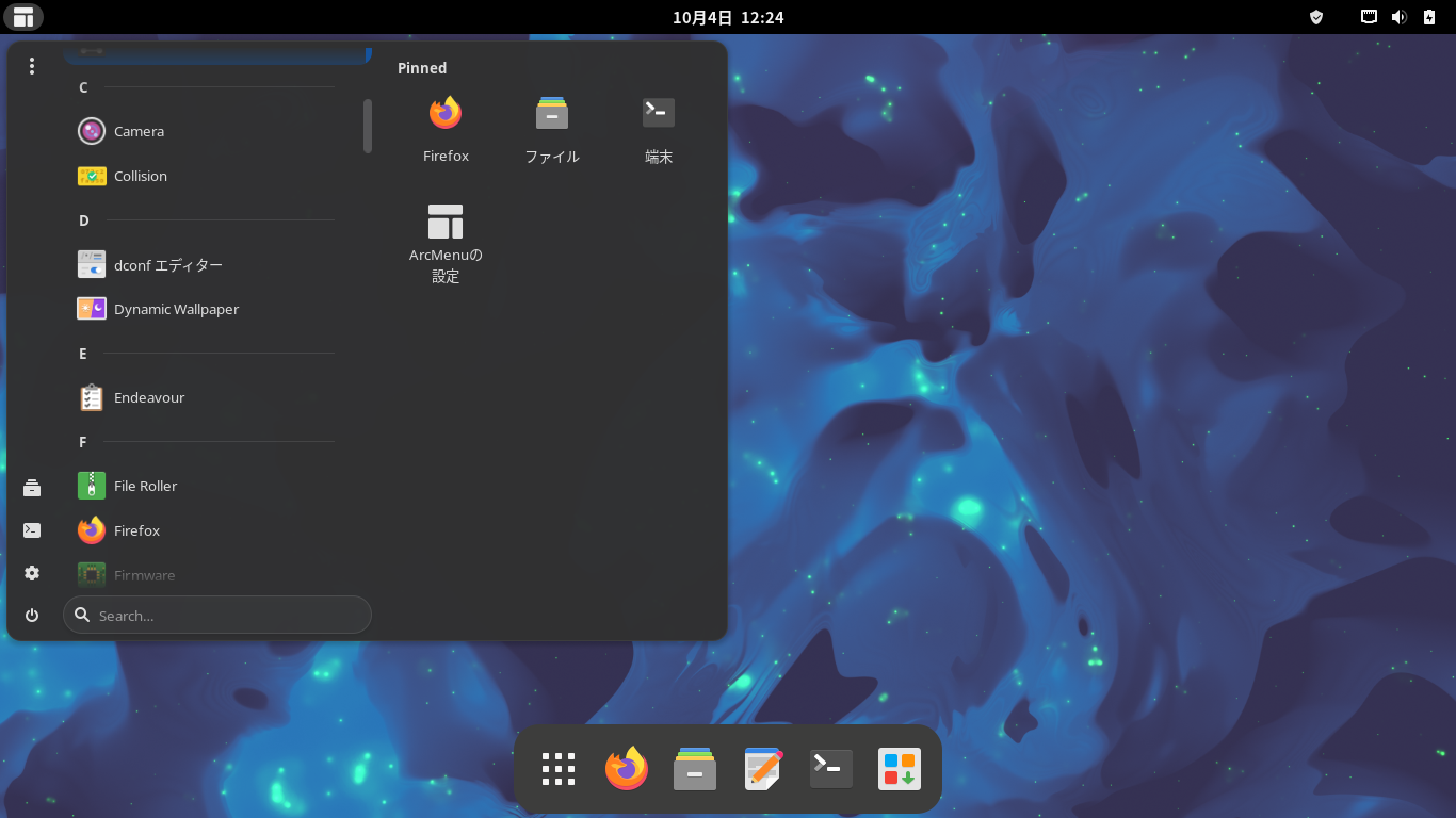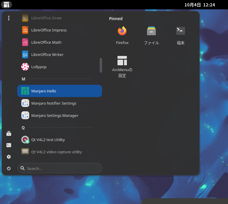 「Manjaro 24.2 GNOME」-「カスタマイズ後のデスクトップ・メニュー」