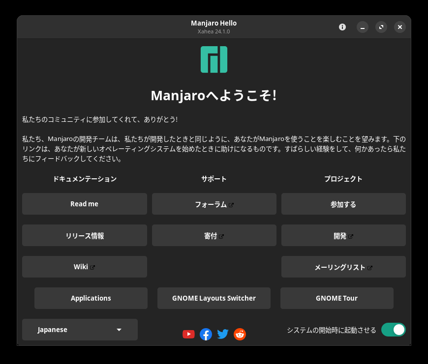 「Manjaro 24.2 GNOME」-「スタート」→「M」→「Manjaro hello」