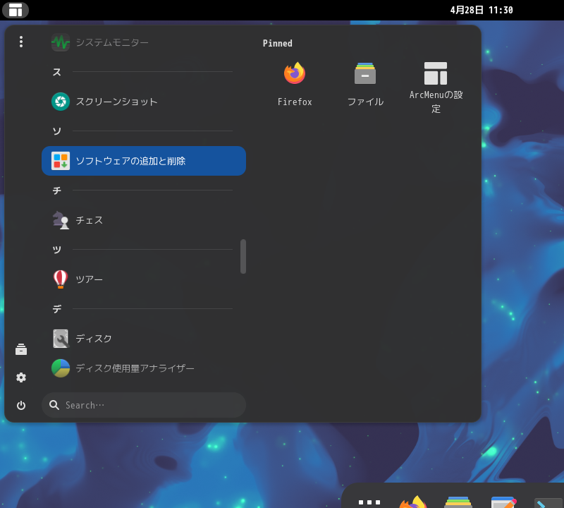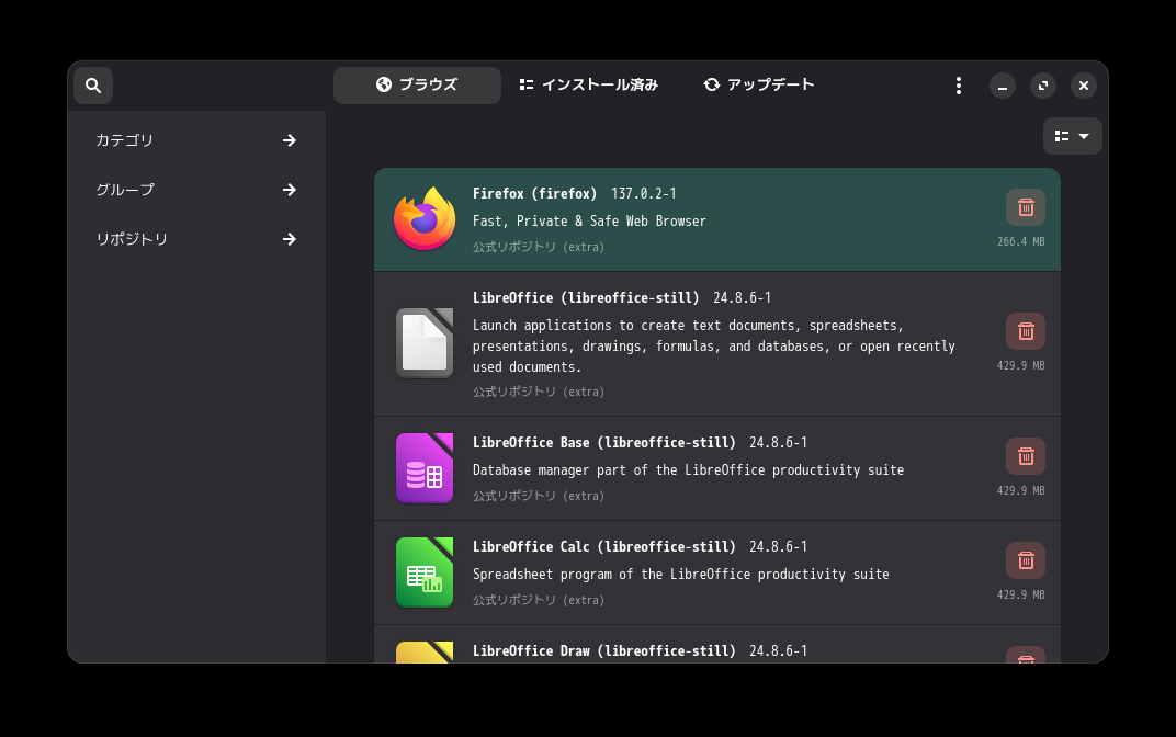 1. 概要 「Pamac」は、パッケージ管理フロントエンドプログラムです。 操作等については、「Linux - 共通事項 - パッケージ管理フロントエンド」をご参照ください。 2. 起動 「スタート」→「ソ」→「ソフトウエアの追加と削除」