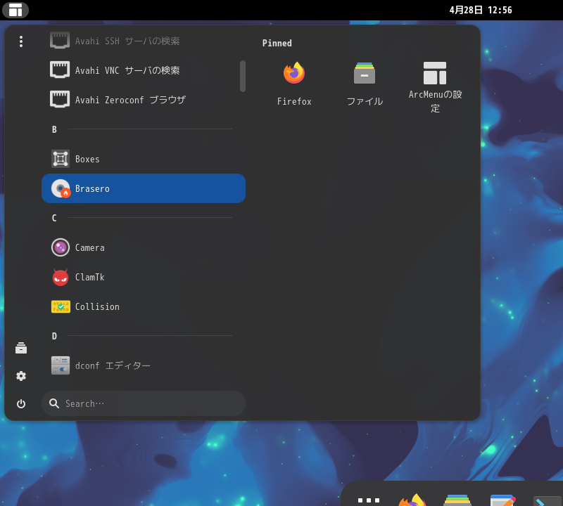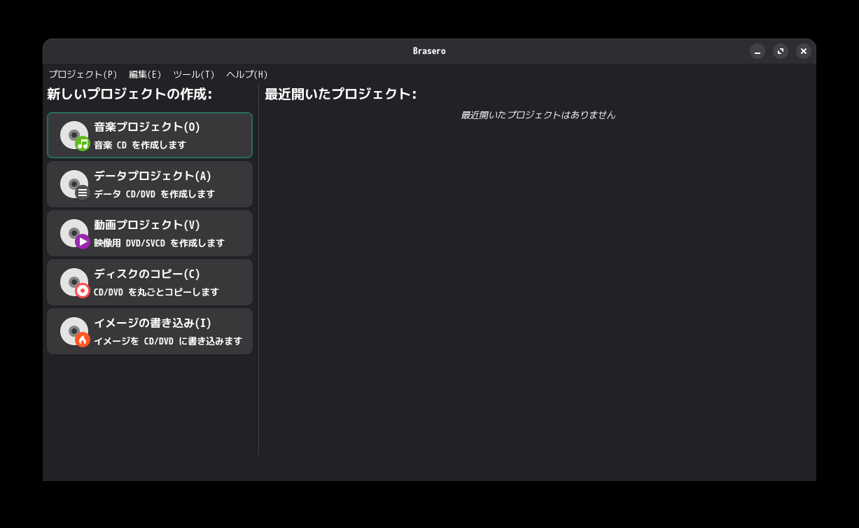 1. 概要 光ディスクのライティングソフトとして「Brasero」を使用します。 2. インストール 「Pamac」で、「brasero」を検索して、インストールします。 3. 起動 「スタート」→「サウンドとビデオ」→「Brasero」
