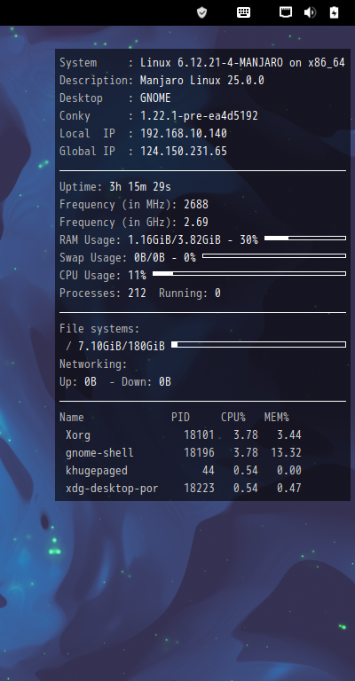 ${color grey}Global IP :$color ${execi 999999 curl -s inet-ip.info}
