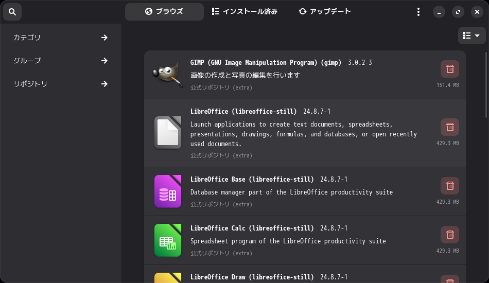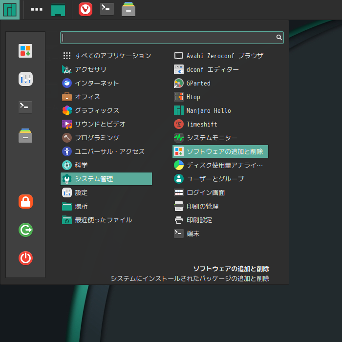 1. 概要 「Pamac」は、「Arch」系のパッケージ管理フロントエンドプログラムです。 操作等については、「Linux - 共通事項 - パッケージ管理フロントエンド」をご参照ください。 2. 起動 「スタート」→「システム管理」→「ソフトウエアの追加と削除」