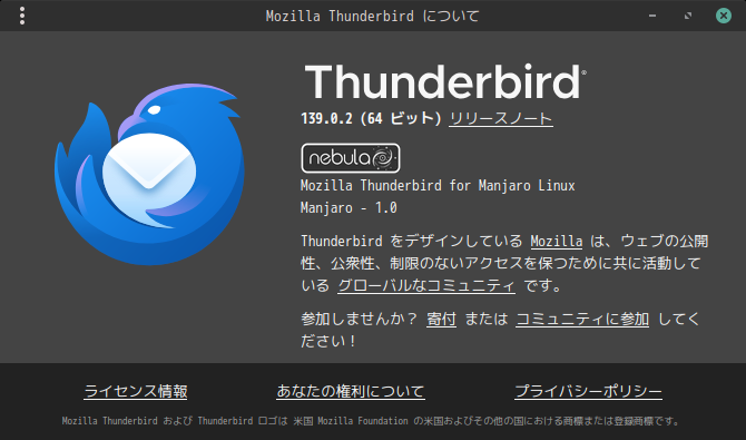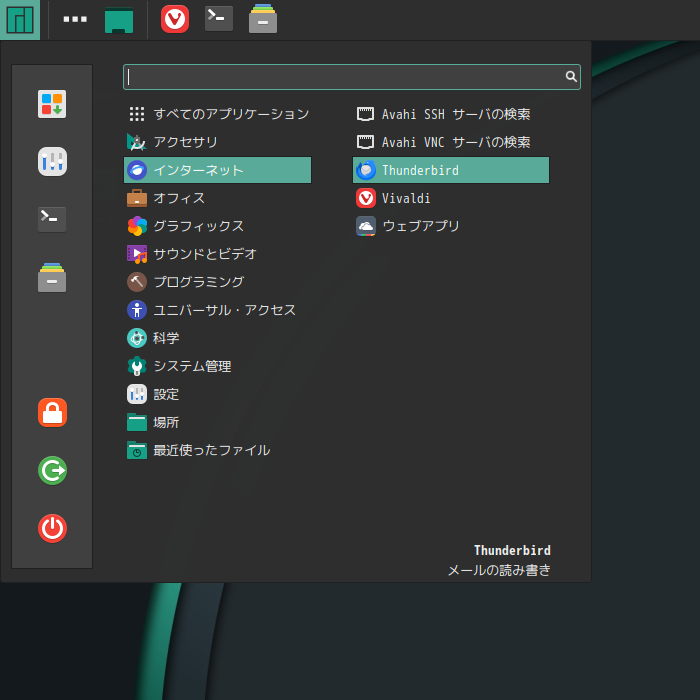 1. 概要 メールクライアントとして、デフォルトで、「Thunderbird」がインストールされています。 日本語化して使用します。 「日本語化」「アカウント設定」や基本的な操作に関しては、「メール クライアント ソフト - Thunderbird」をご参照ください。 2. 起動 「スタート」→「インターネット」→「Thunderbird」