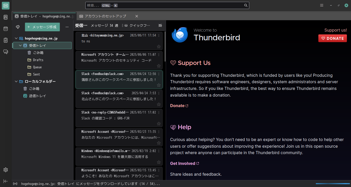 起動直後に、受信トレイを開いた状態です。