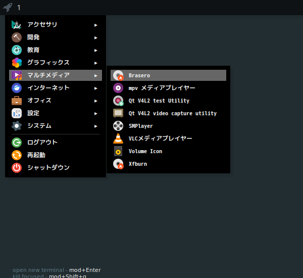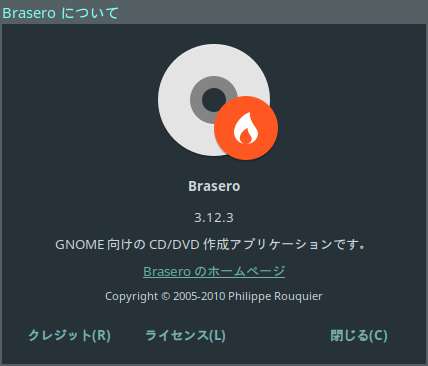 1. 概要 光ディスクのライティングソフトとして、「Brasero」を使用します。 2. インストール 「root」ユーザ権限で。 yes | pacman -S brasero 3. 起動 「スタート」→「マルチメディア」→「Brasero」