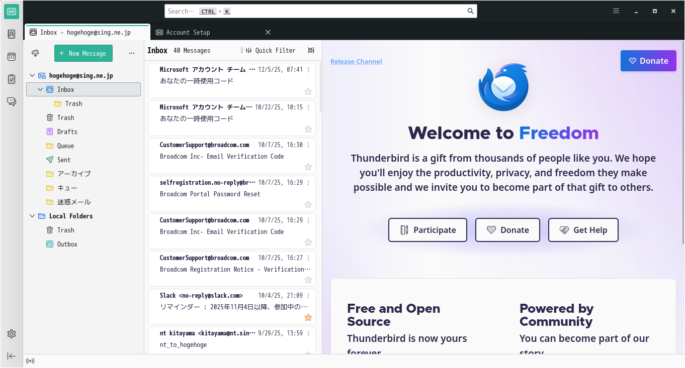 1. 概要 メールクライアントとして、「Thunderbird」を使用します。 今回、「full edition」をインストールしたせいか、「Thunderbird」はデフォルトでインストールされています。 日本語化、メールアカウント設定やその他の操作に関しては、「メール クライアント ソフト - Thunderbird」をご参照ください。 2. 起動 「スタート」→「インターネット」→「Thunderbird」