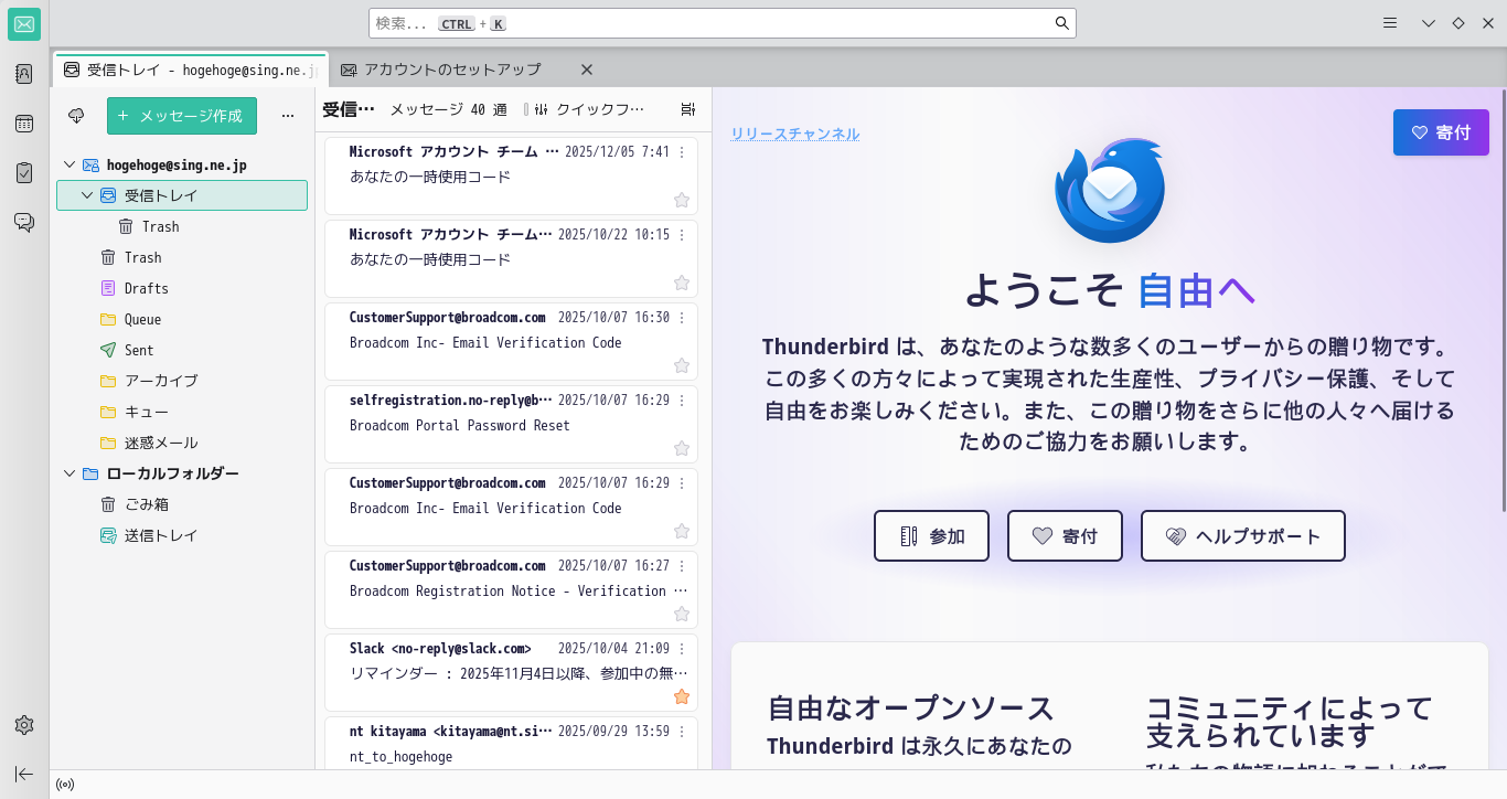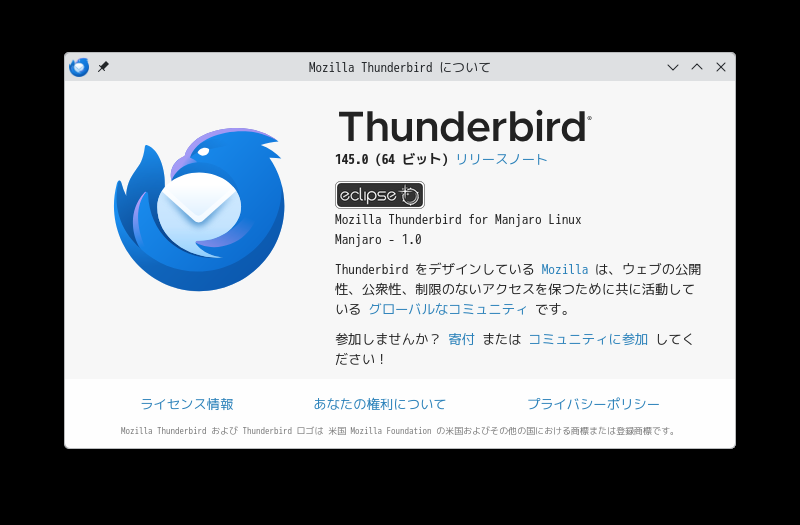 1. 概要 メールクライアントとして、「Thunderbird」を使用します。 メールアカウント設定やその他の操作に関しては、「メール クライアント ソフト - Thunderbird」をご参照ください。 2. 起動 「Pamac」で、「thunderbird-i18n-ja」を検索して、インストールします。 2. 起動 「スタート」→「インターネット」→「Thunderbird」