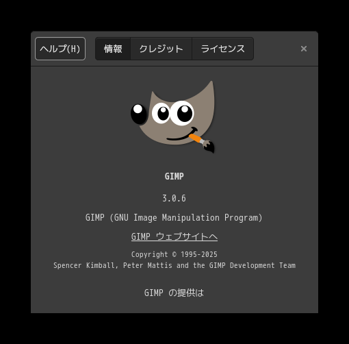 「閉じる」 起動直後の状態です。 2026年1月5日の時点で、下記のバージョンでした。 「EndeavourOS」に続いて、同じ「Arch」組の「Manjaro」も「GIMP2」から「GIMP3」へ移行したようです。 操作については、「画像編集ソフト - GIMP」に掲載しています。 上記は簡単なものですので、詳細なものがほしい方は、各所に初歩の手引きから応用編までありますので、そちらを参考にしてください。 |