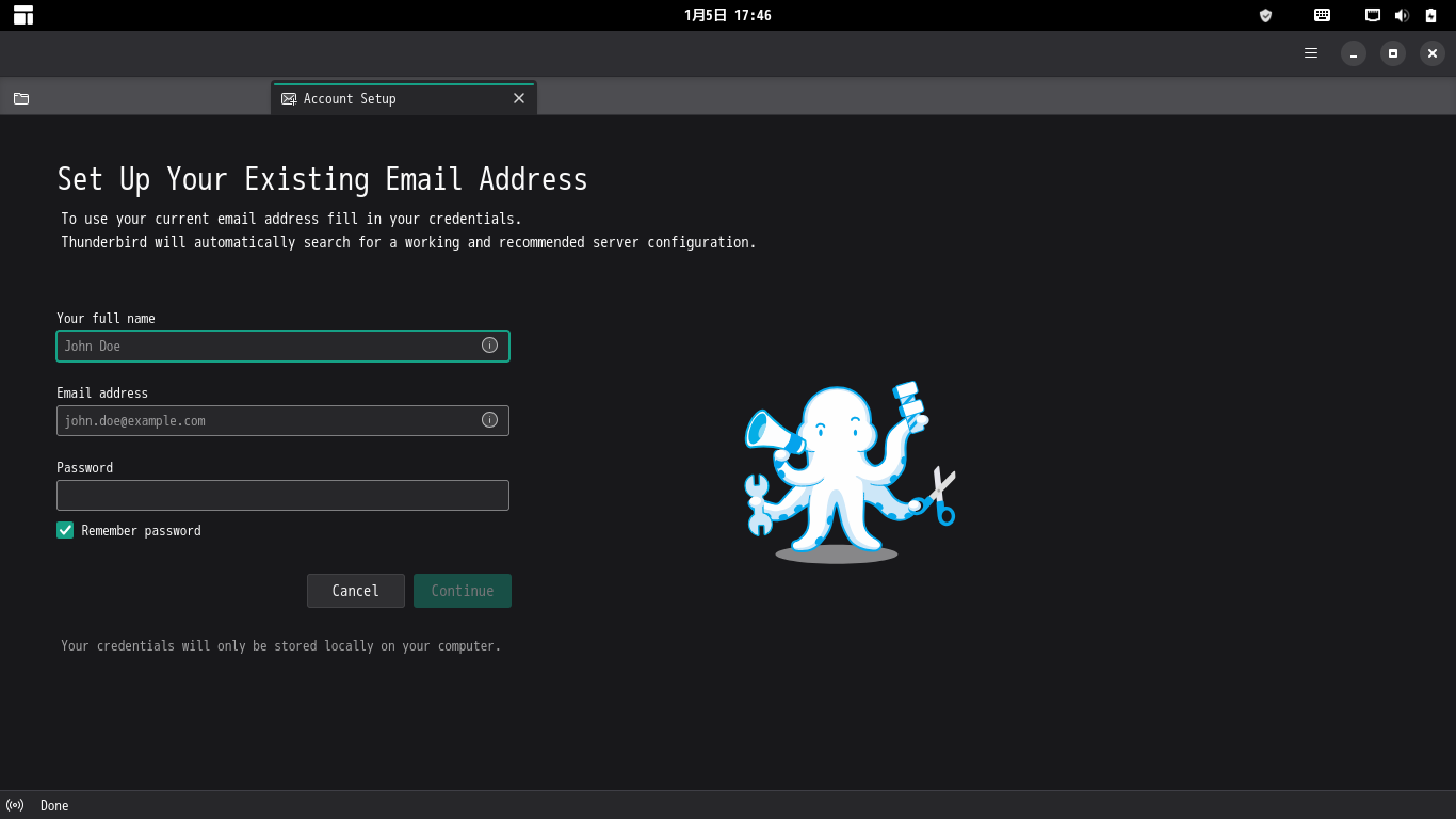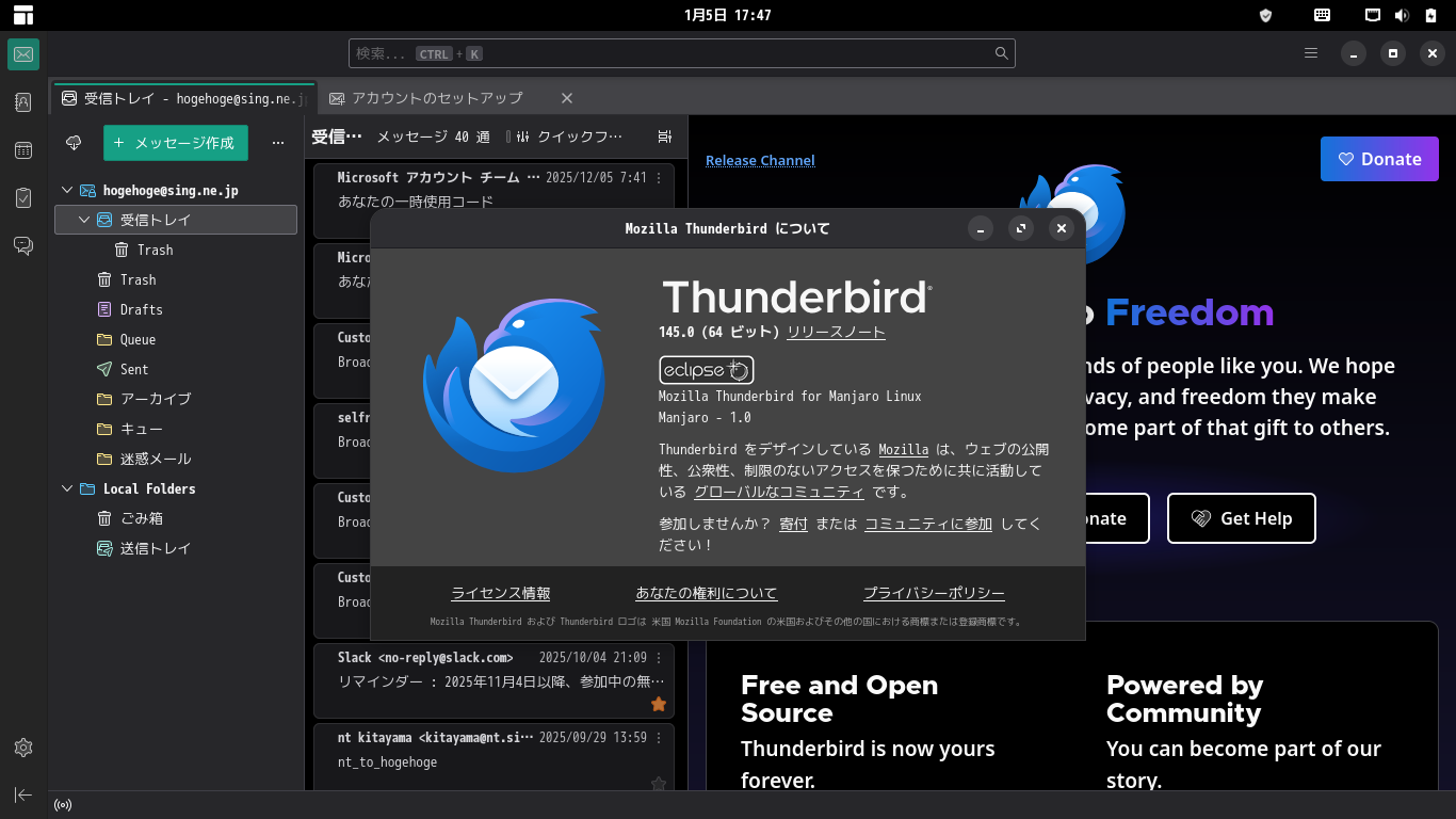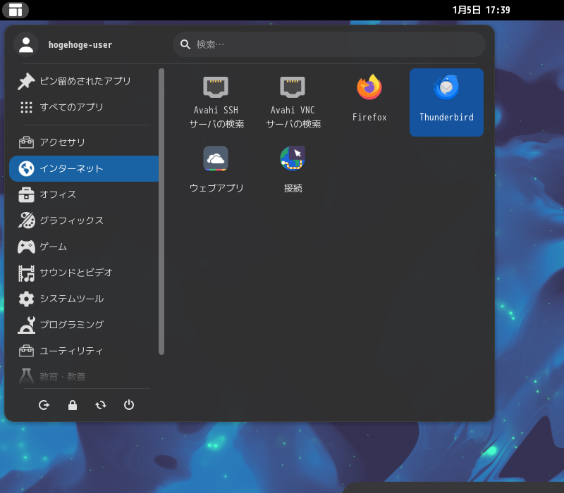 1. 概要 メールクライアントとして、「Thunderbird」がデフォルトでインストールされています。 日本語化して、使用します。 「アカウント設定」や基本的な操作に関しては、「メール クライアント ソフト - Thunderbird」をご参照ください。 2. 起動 「スタート」→「インターネット」→「Thunderbird」