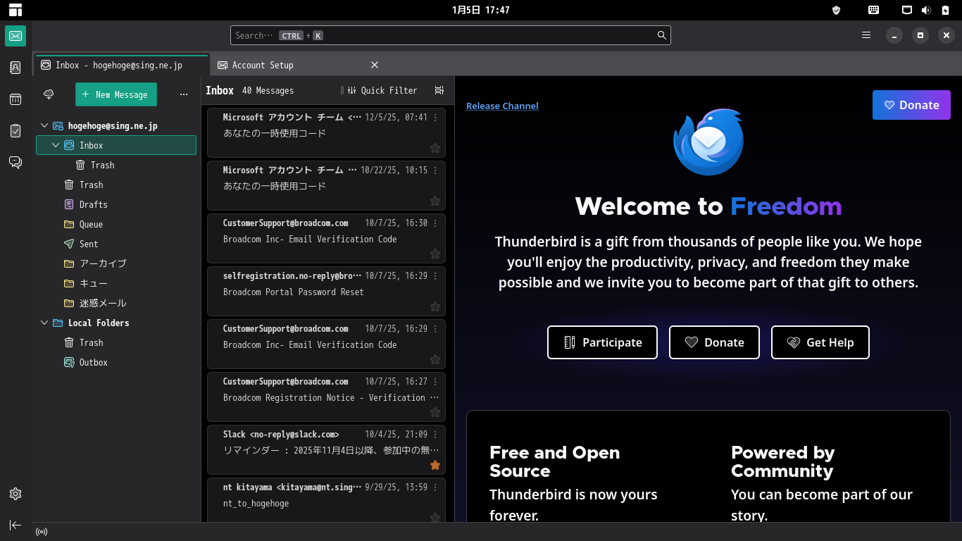 起動直後に、受信トレイを開いた状態です。